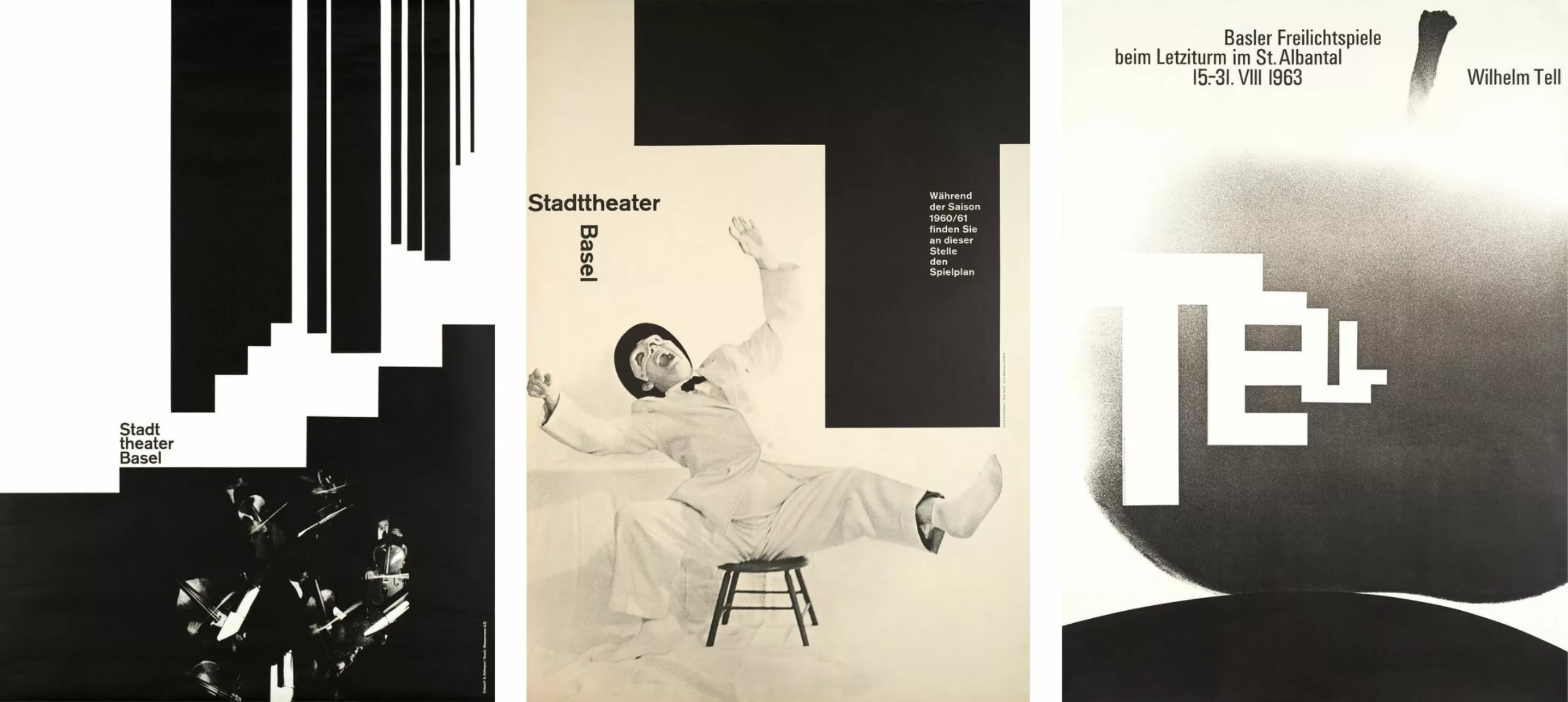 Two posters by Armin Hofmann, one of the leading figures of the so-called Basel School, stand out. The first, for the Stadttheater Basel, was awarded the Prix de l’Affiche Suisse in 1960. A black-and-white poster, in the image of Hofmann’s rigor. A very present, graphic typography overhangs an unstably balanced figure.