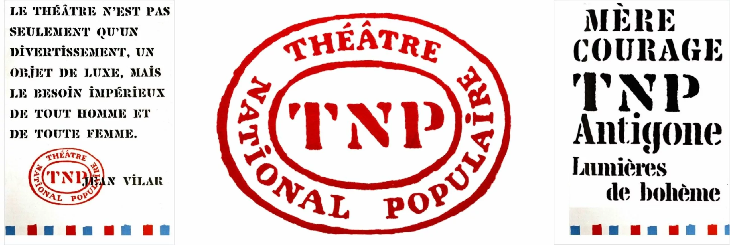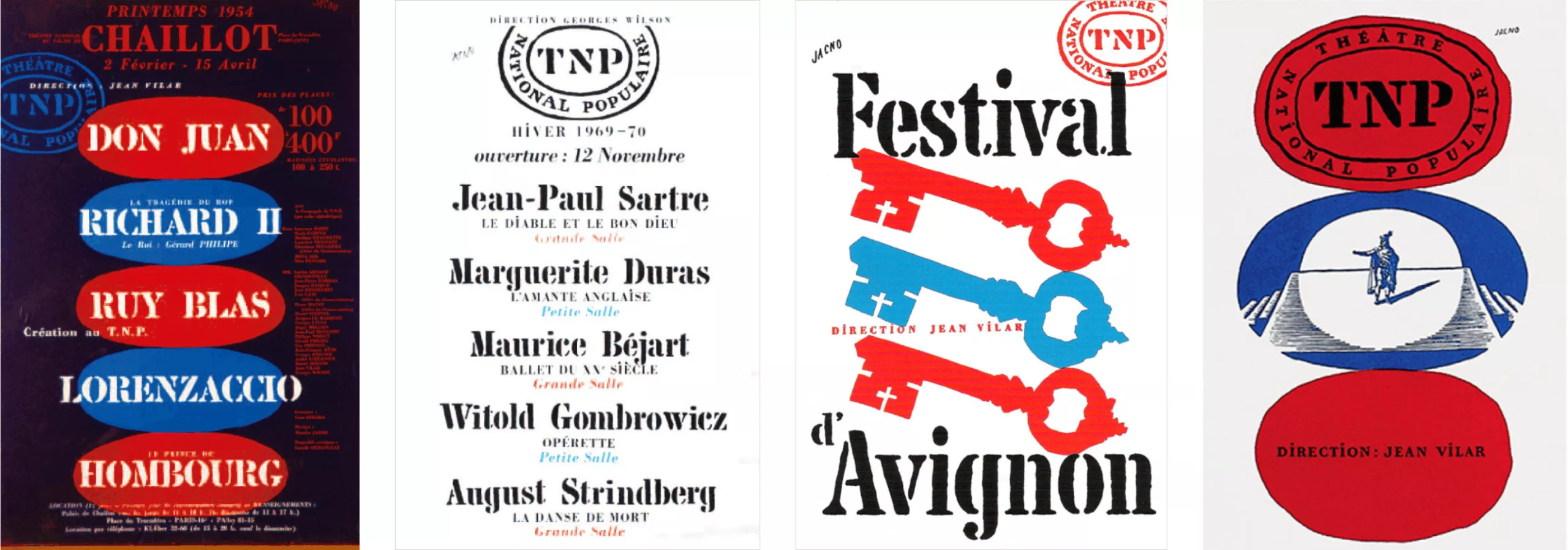 “As with all effective graphic design,” he argued, “there are, in the posters of a theatrical enterprise, two elements that, when consistently repeated, must be easily perceived by the eye and grasped by the mind. First, the color; then, the typography of the main titles, which, while remaining highly legible, must also be strikingly distinctive. In blue, white, and red, the posters of the TNP and the Avignon Festival bore, along with that torch, the hallmark of a culture belonging to the people, in the ‘French Revolution style.’”