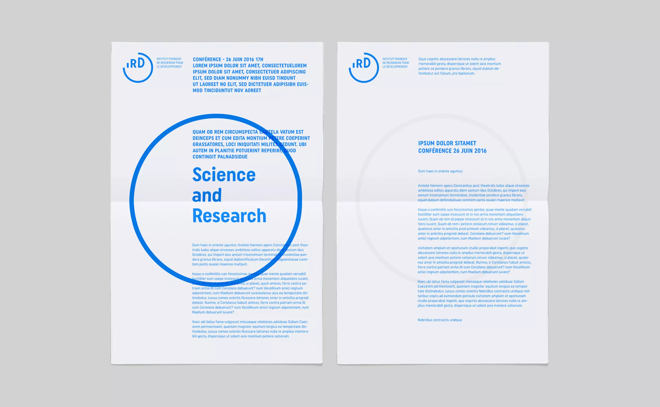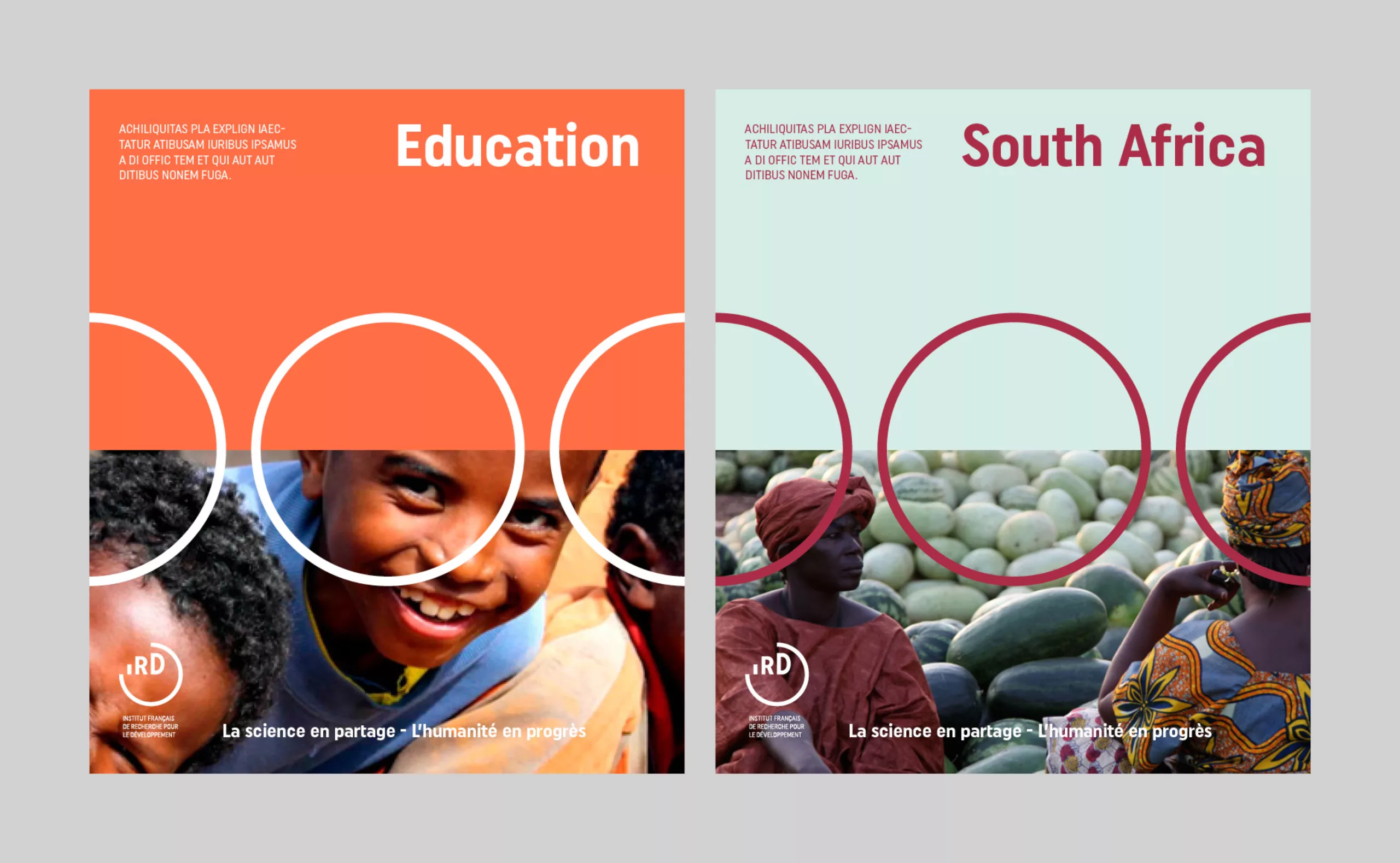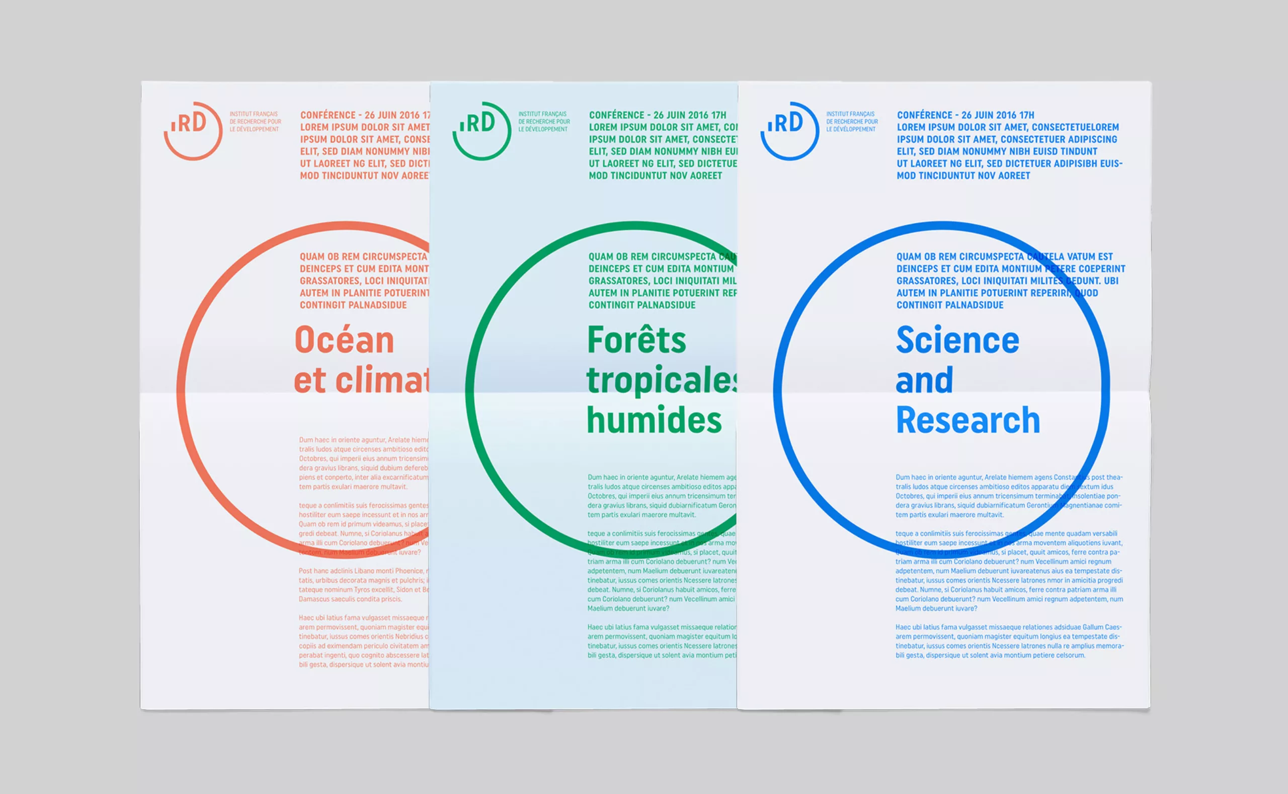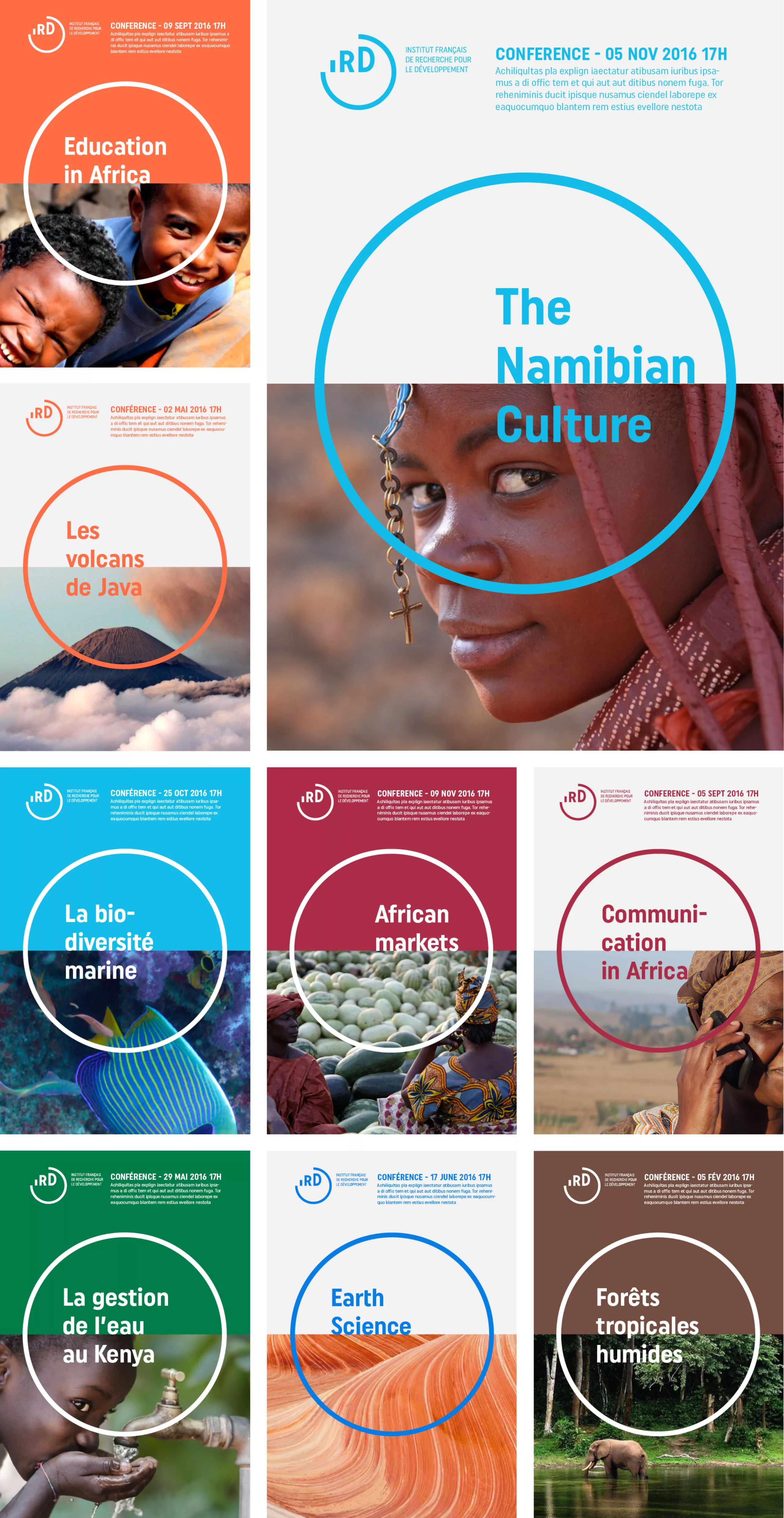 Later on in the graphic chart, the logo is positioned in between North and South, illustrating the idea of “sharing science”, and allowing to value the incredible iconographic background of the IRD.