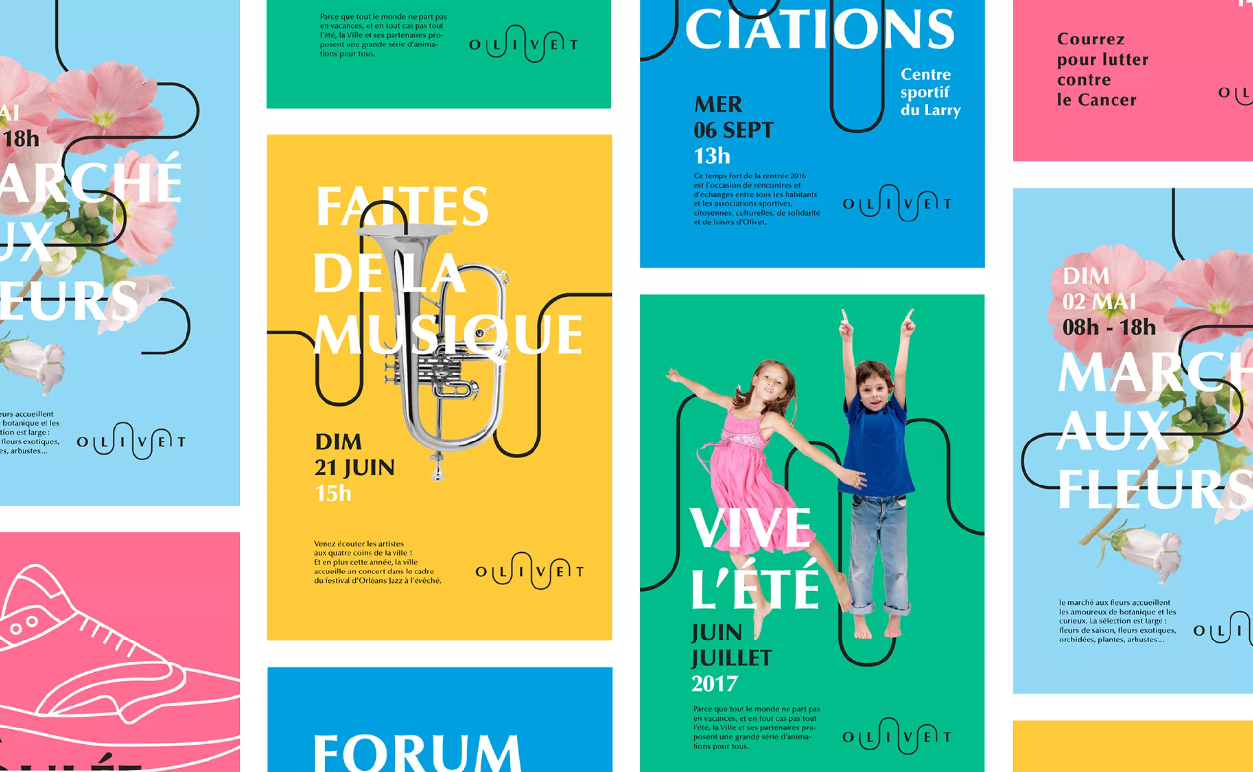 Olivet is a town of 20,000 inhabitants, located near Orléans, France. We built our proposal of visual identity (that wasn’t selected by the client) on the geographical situation and the proximity to the Loiret river, which draws the identity of the city.