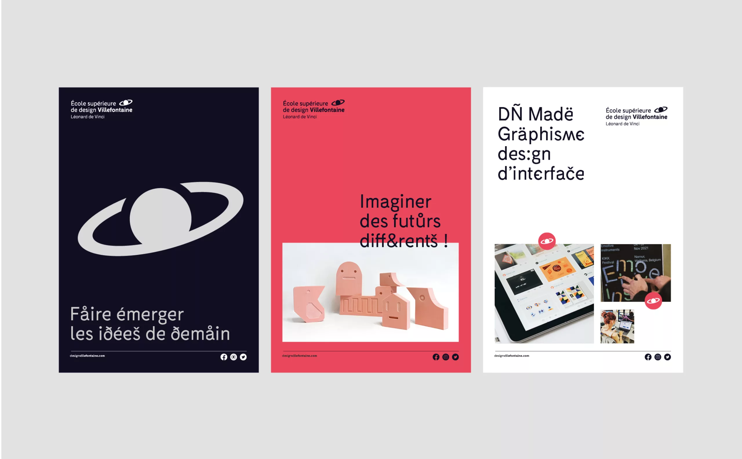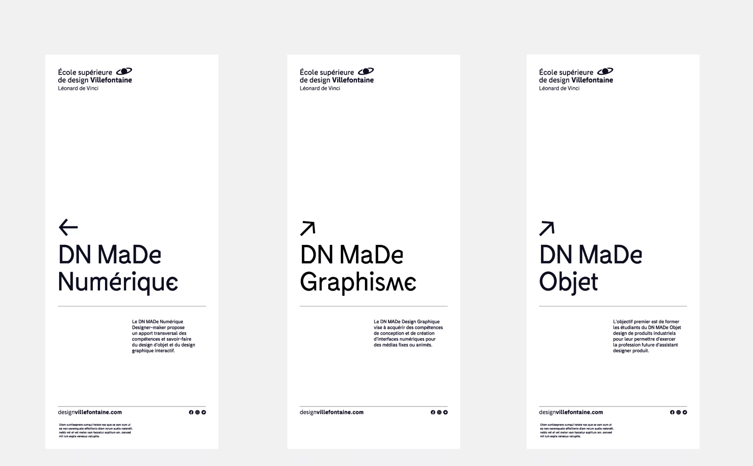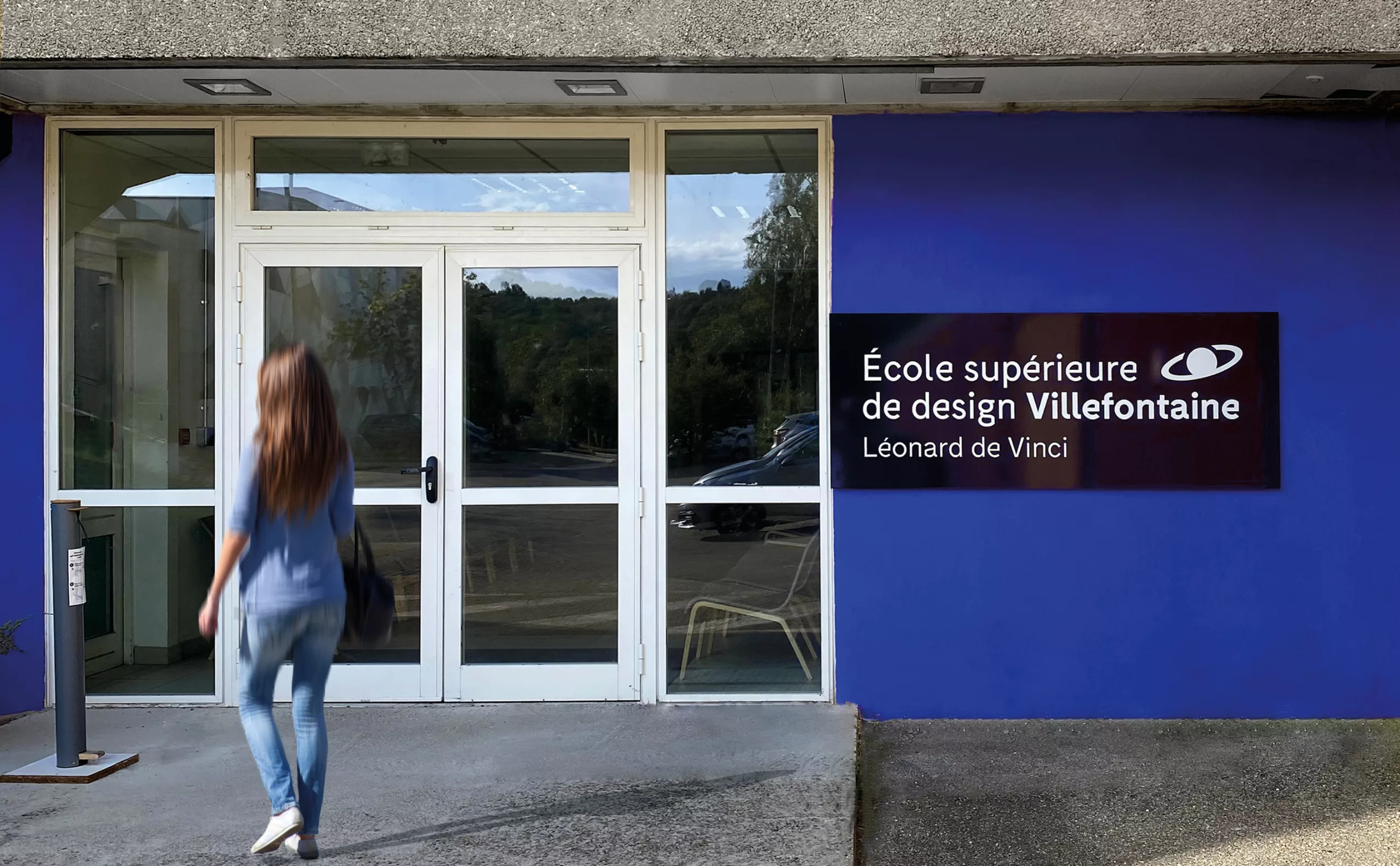 In 2022, the health context of the last few years and the competition between schools raise the question of the school’s own distinctive character and identity. The “Pôle Supérieur de Design” then becomes “École Supérieure de Design Villefontaine“: more legitimate, more competitive, more distinguishable. New strategic issues were taken into account: the course of study had to be more distinct from the other courses offered by the school, while remaining associated with them. Graphically, the previous logo already met strong identification and demarcation needs. The arrow, whose sign has been removed from the circumflex accent of “pole”, plays its role as a signpost to which everyone can refer. But beyond a message of progression, it did not tell much. A big miss when you know the strength of the storytelling built in 2012 and in particular of the baseline “A degree from elsewhere“.