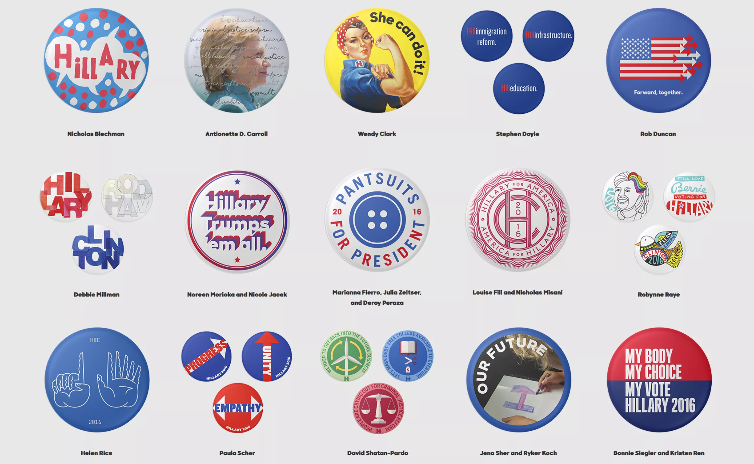 En 2016 elle conçoit des pin’s pour soutenir la campagne électorale d’Hillary Clinton, aux côtés de 45 autres designers comme Paula Scher ou Michael Beirut, et observe comment un bon design peut permettre à des candidats de gagner des voix.