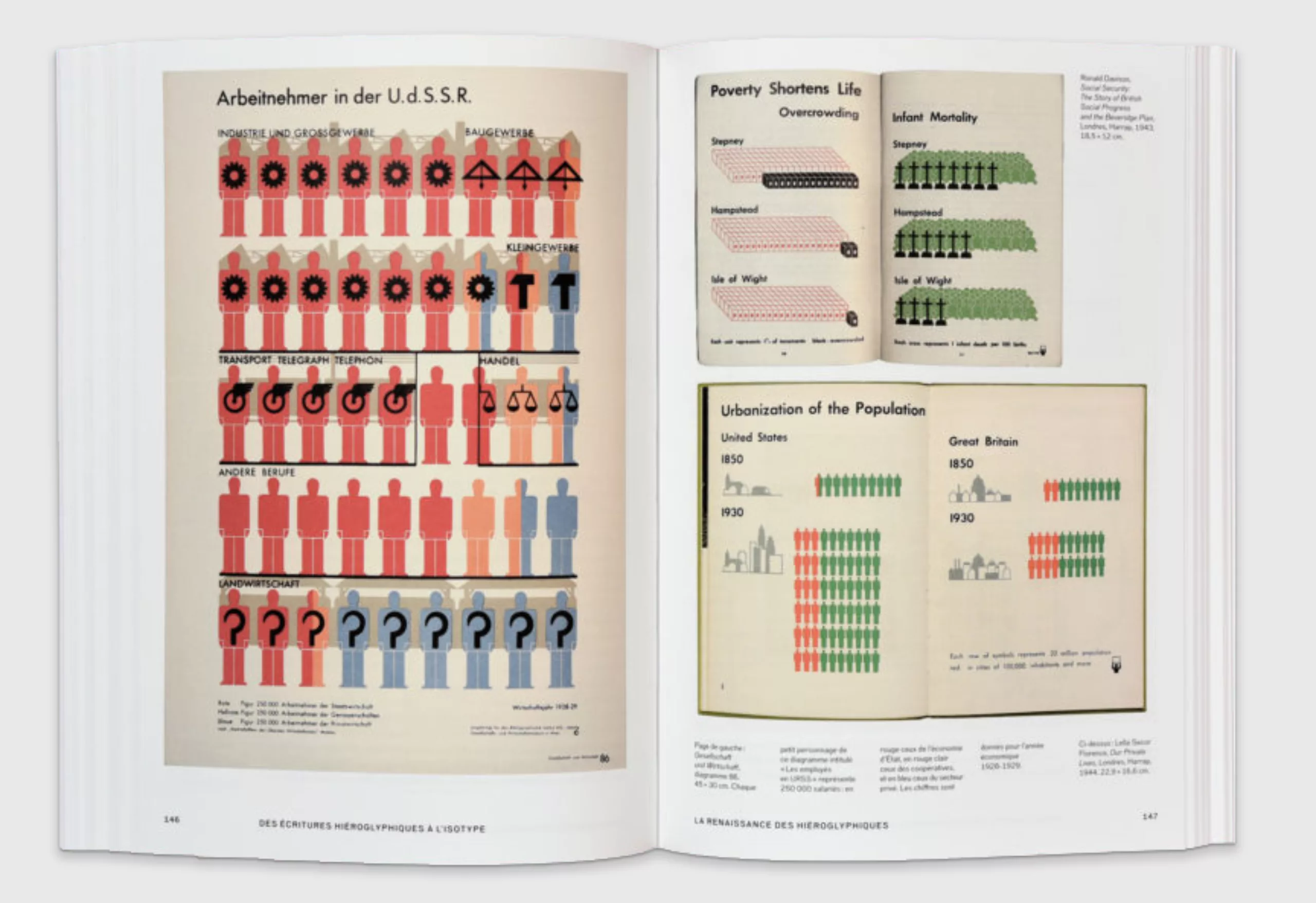 Dans les années 1920s, l’Allemagne et l’Autriche traversent une crise post-guerre. Dans un souci d’émancipation des travailleurs on souhaite démocratiser le savoir en rendant l’information accessible à toutes les classes sociales, surtout les plus basses. C’est ainsi que naît l’Isotype, (d’abord “méthode des statistiques visuelles de Vienne”) vers 1925, “une écriture de hiéroglyphes compréhensible par tous et pouvant être utilisée en tant que signes universels” comme le souligne Otto Neurath, sociologue et économiste viennois inventeur du concept. Du grec “forme, égale” (caractéristique commune partagée), l’Isotype est une solution infographique, une “statistique par l’image” qui explique, simplifie et représente des causes et des phénomènes grâce à des symboles répétés et de proportions fixes, des pictogrammes, à travers des diagrammes statistiques. En 1930 Otto Neurath, sa future femme Marie et l’artiste Gerd Arntz analysent, simplifient et dessinent -respectivement- un Atlas (Atlas Gesellschaft und Witschaft) avec 100 illustrations pour illustrer et rendre accessible au plus grand nombre des statistiques mondiales : population, pays et continents, influences de pouvoir, échanges mondiaux divers et relations politiques ou militaire, croissance urbaine et conditions des travailleurs… Ce langage pictographique et statistique s’exporte en URSS et aux États-Unis, pour lesquels Gerd Arntz dessine des centaines de visuels.