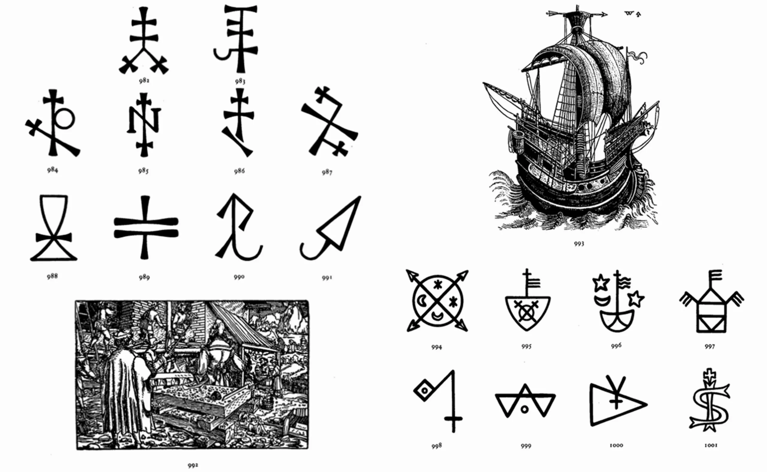 On pense aussi aussi aux idéogrammes chinois aux formes épurées, aux pictogrammes précolombiens riches en détails comme des seaux, tout comme les hiéroglyphes (du grec hiéros, sacré, et gluphein, graver : écriture des Dieux). Ces deux dernières formes d’écritures, ancêtres des icônes dont nous parlons plus bas, combinent pictogrammes (signes images) et phonogrammes (signes sons) s’associant par rébus en idéogrammes (signes idée) lisibles comme des poèmes de texte et d’image.
