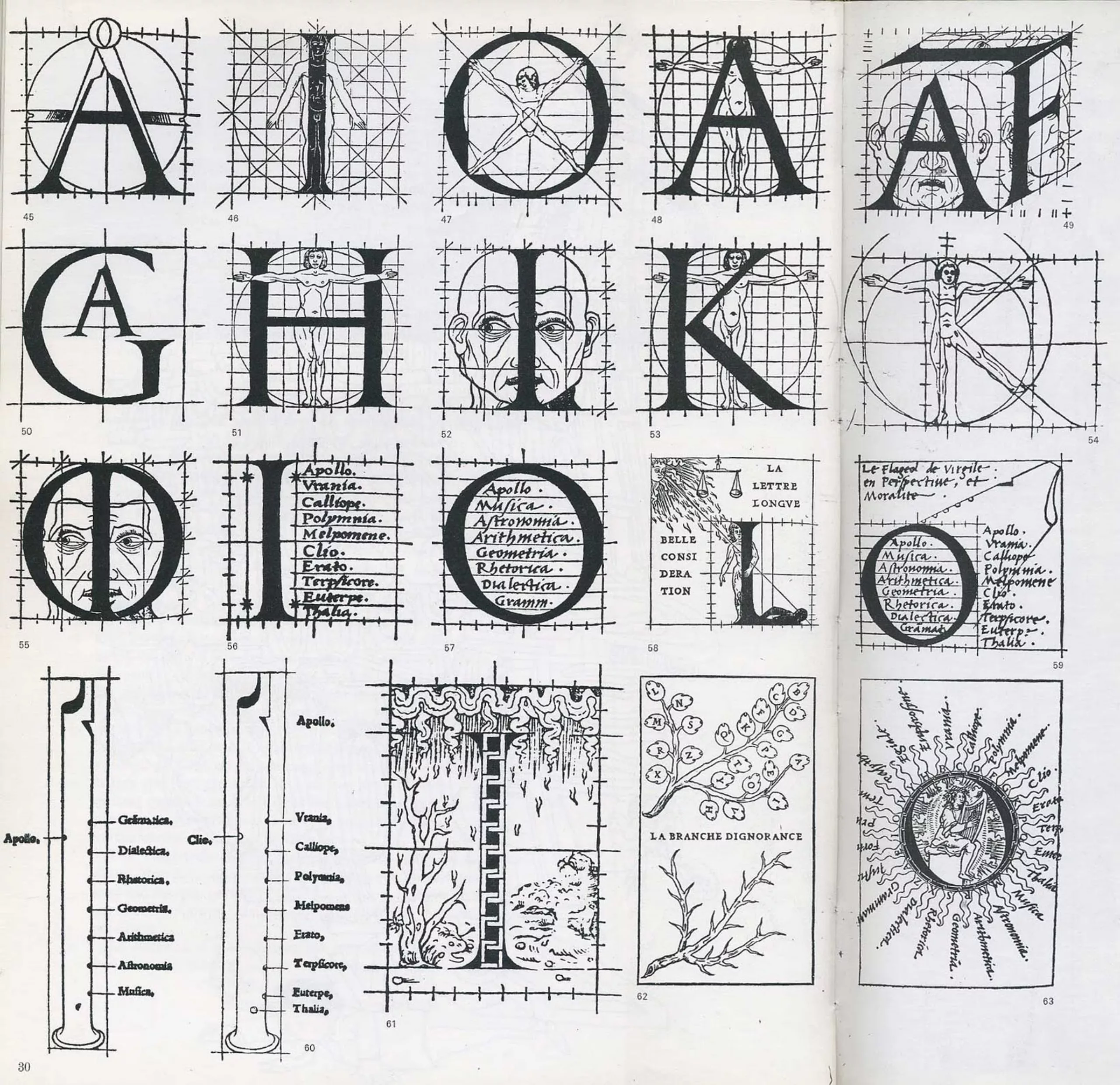 Inspiré de ses contemporains Dürer ou Léonard de Vinci à qui l’on doit de nombreuses recherches sur le corps humain, il développe des alphabets idéaux inspirés des proportions de la Nature, qu’il réunit dans son étude Champ Fleury (pages illustrées ci-dessous). Chaque lettre s’inscrit dans des proportions harmonieuses tirées du corps humain ou du vivant, comme les lettres O et A, qui rappellent bien sûr l’homme Vitruvien de De Vinci.