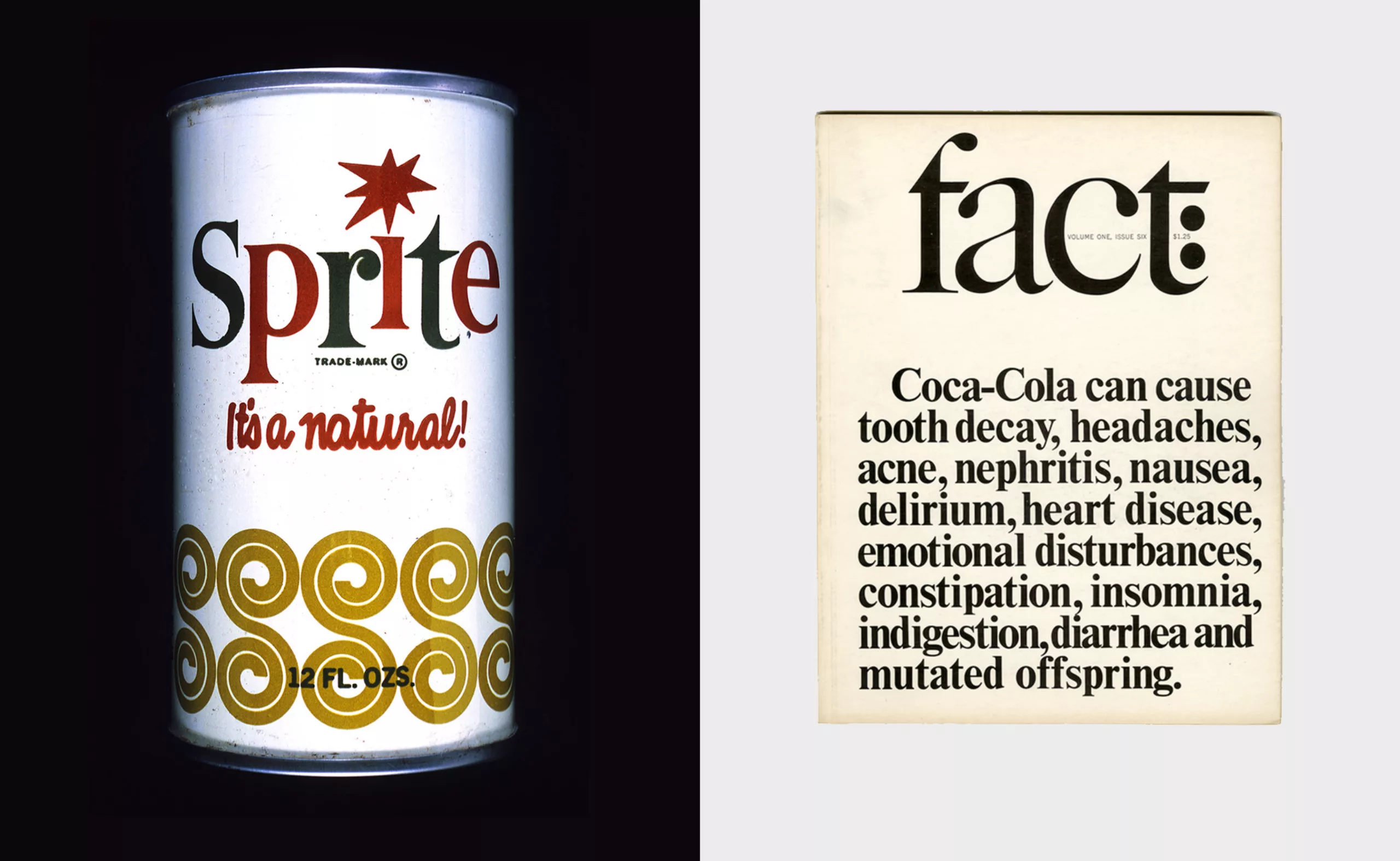 En 1964, Lubalin réalise l’identité de la nouvelle boisson Sprite, la nouvelle boisson de Coca-Cola, en collaboration avec les équipes du client. L’identité est pétillante et fraîche, inspirée du pop art, mais quelque peu diluée par rapport à ce qu’il a l’habitude de faire. Quelques mois plus tard Lubalin publie un fact: qui dénonce les produits de son client. Étrangement, ou peut-être parce que c’était l’un des meilleurs DA de l’époque, Coca-Cola poursuit ses collaborations à ses côtés.