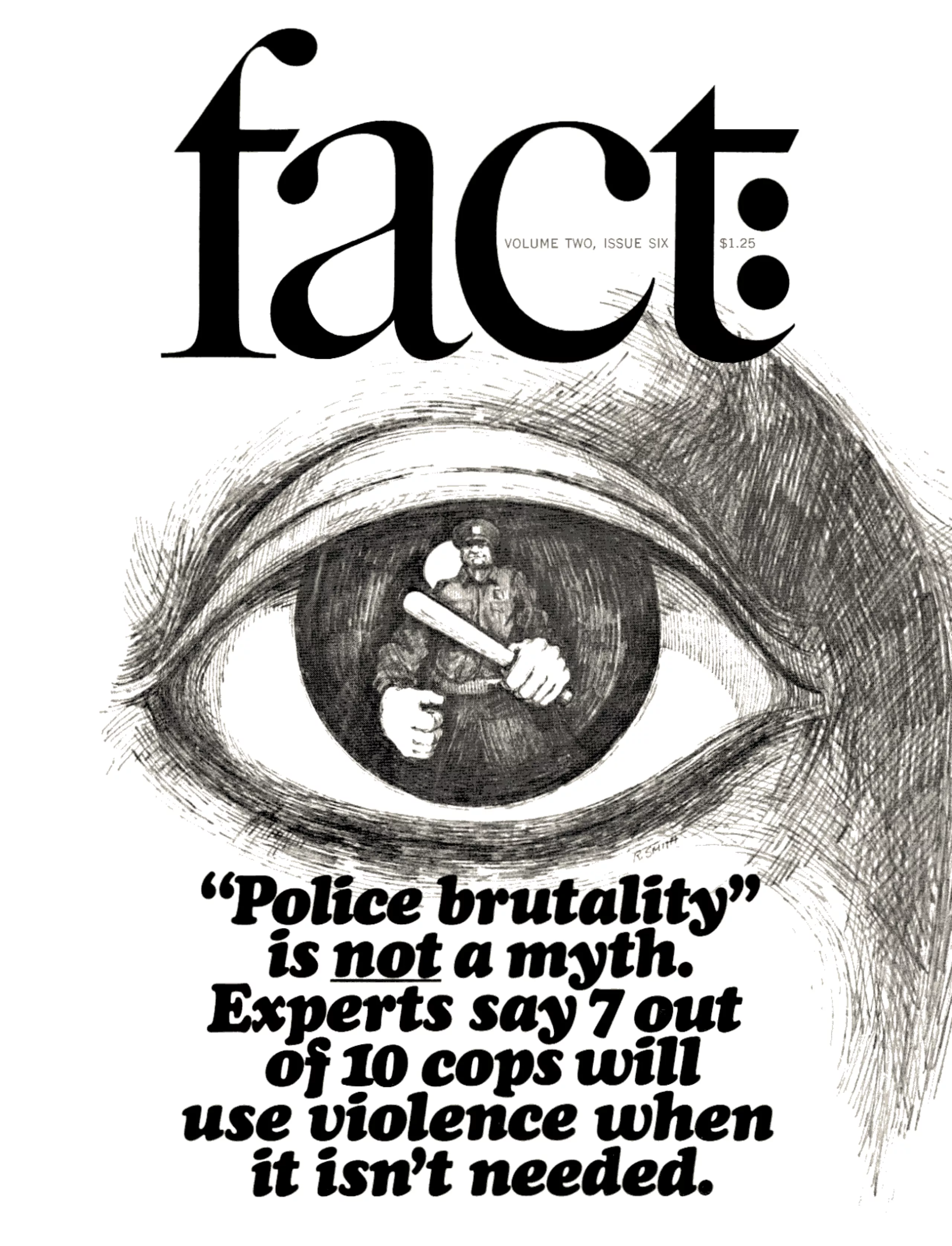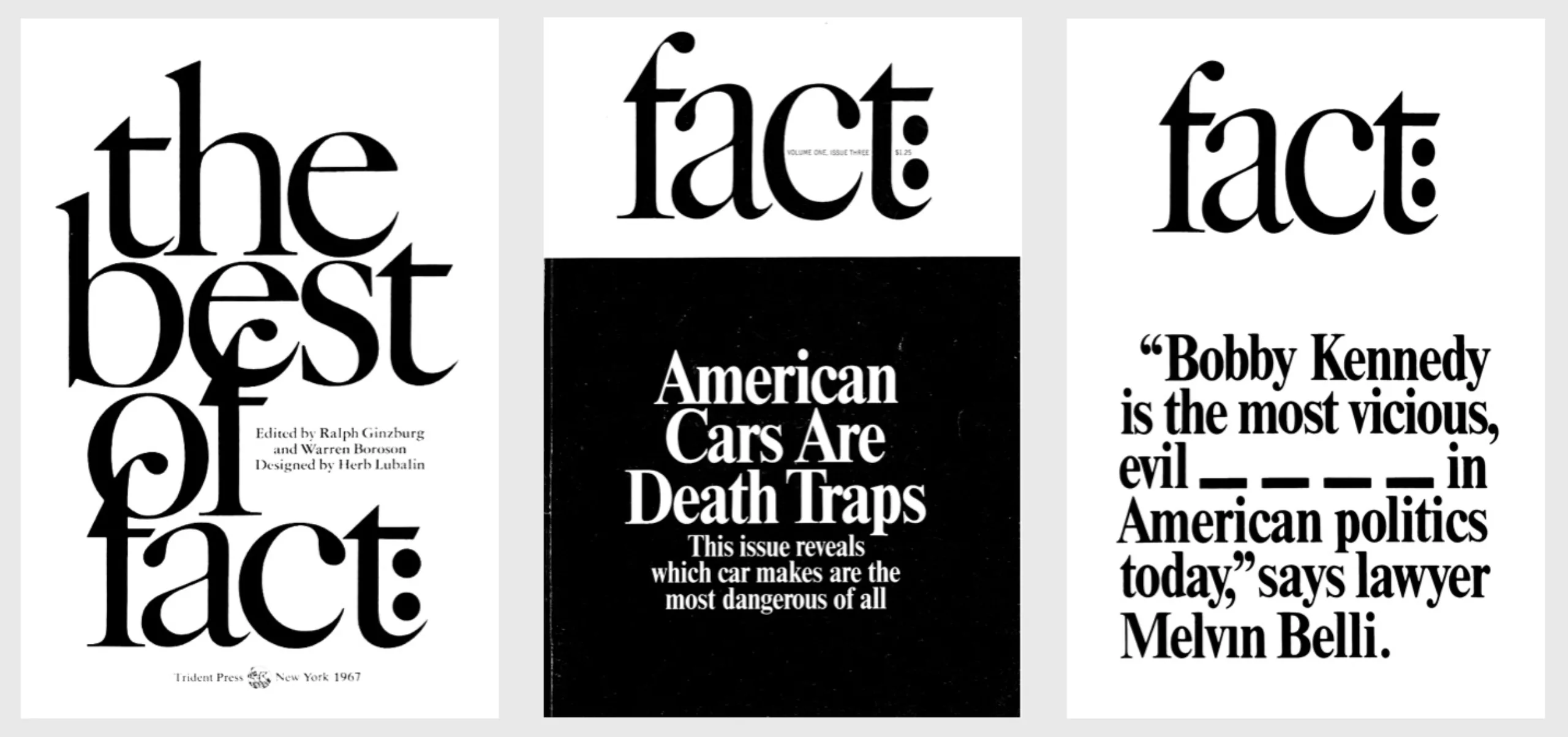 À sa sortie de prison Ginzburg publie Fact en s’associant une fois de plus avec Lubalin. Toujours directeur artistique, il en réalise le logo et la mise en page à moindre frais et intégralement en noir et blanc, en utilisant très simplement le Times Bold sur la couverture et en Regular à l’intérieur sur deux colonnes. Fact: est un magazine politiquement engagé qui soutient ou dénonce des causes via du journalisme d’investigation. Son minimalisme, sa typo unique à empattement, les faits énoncés sur la couverture et son unique illustrateur en font une espèce d’affirmation, de manifeste, annoncé par le nom, fact (fait établi), dans lequel l’usage de la typographie y est un outil audacieux, innovant et visionnaire.