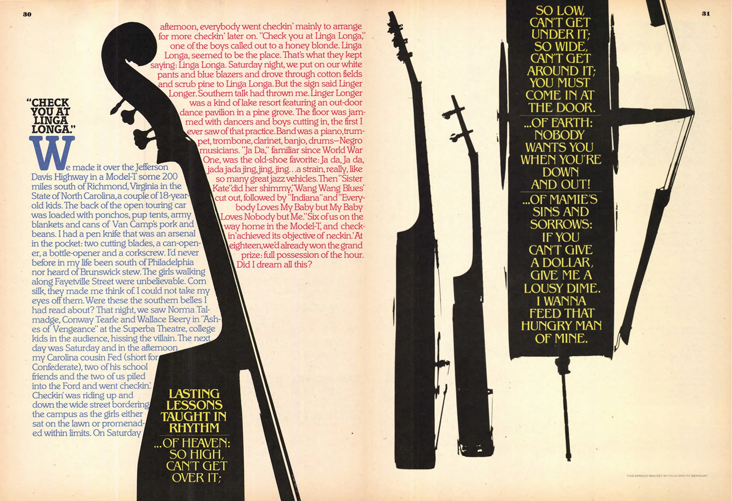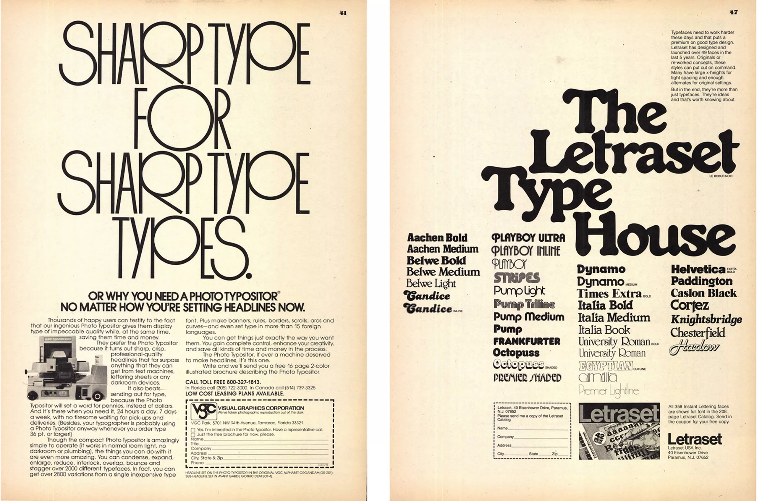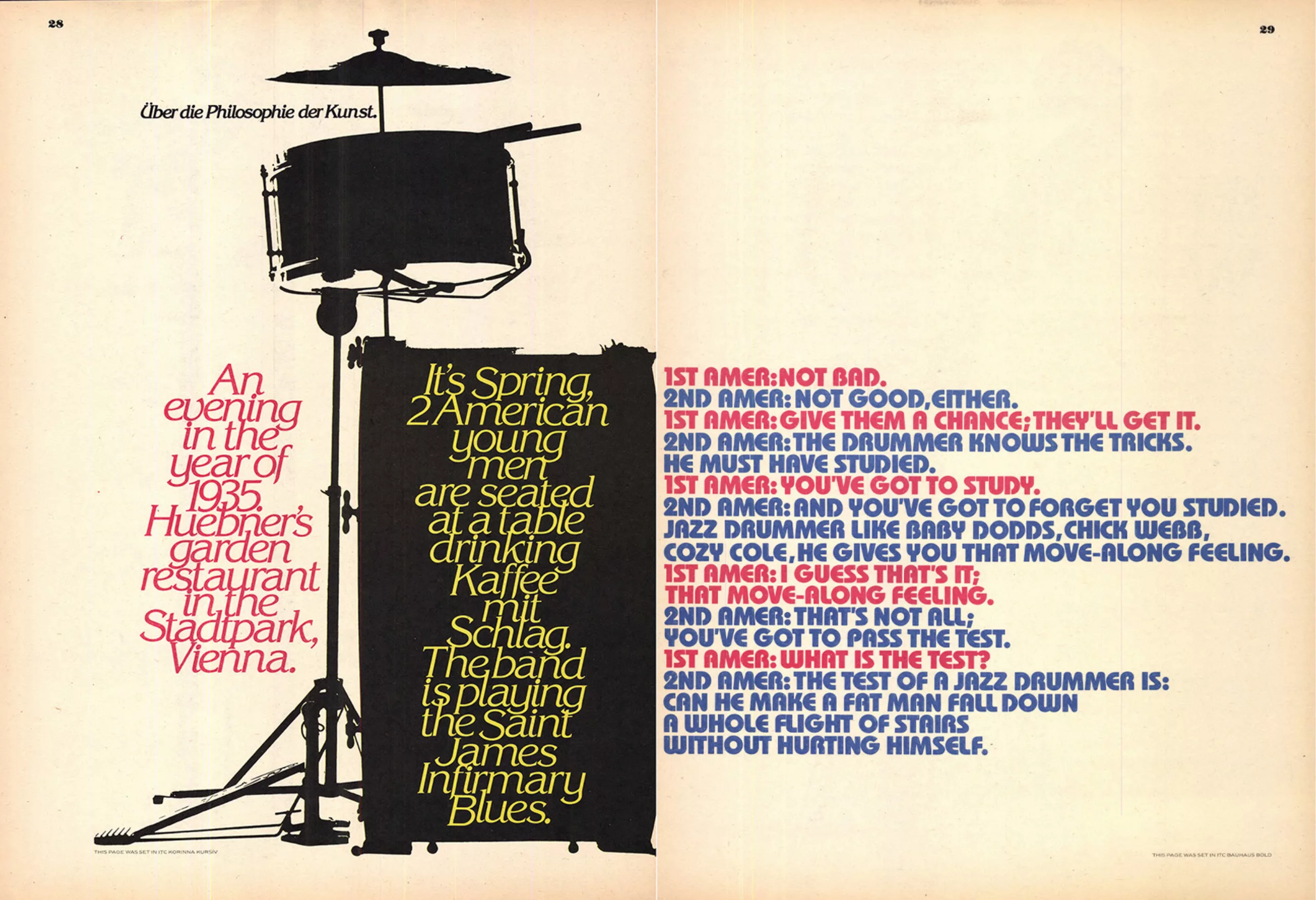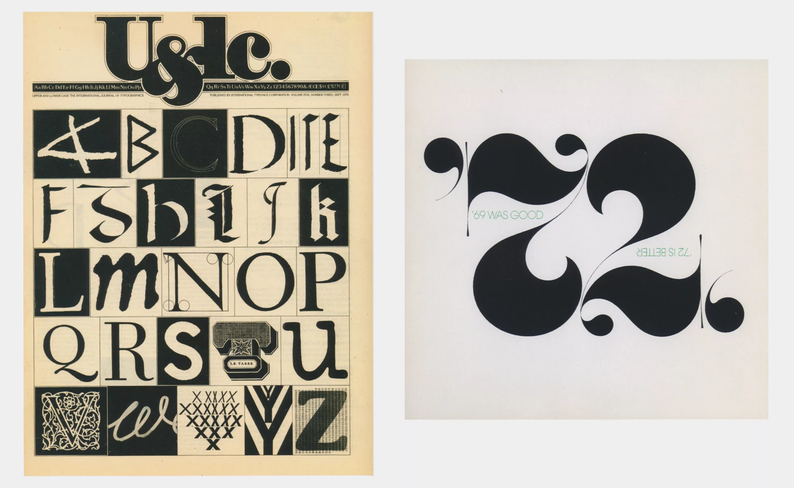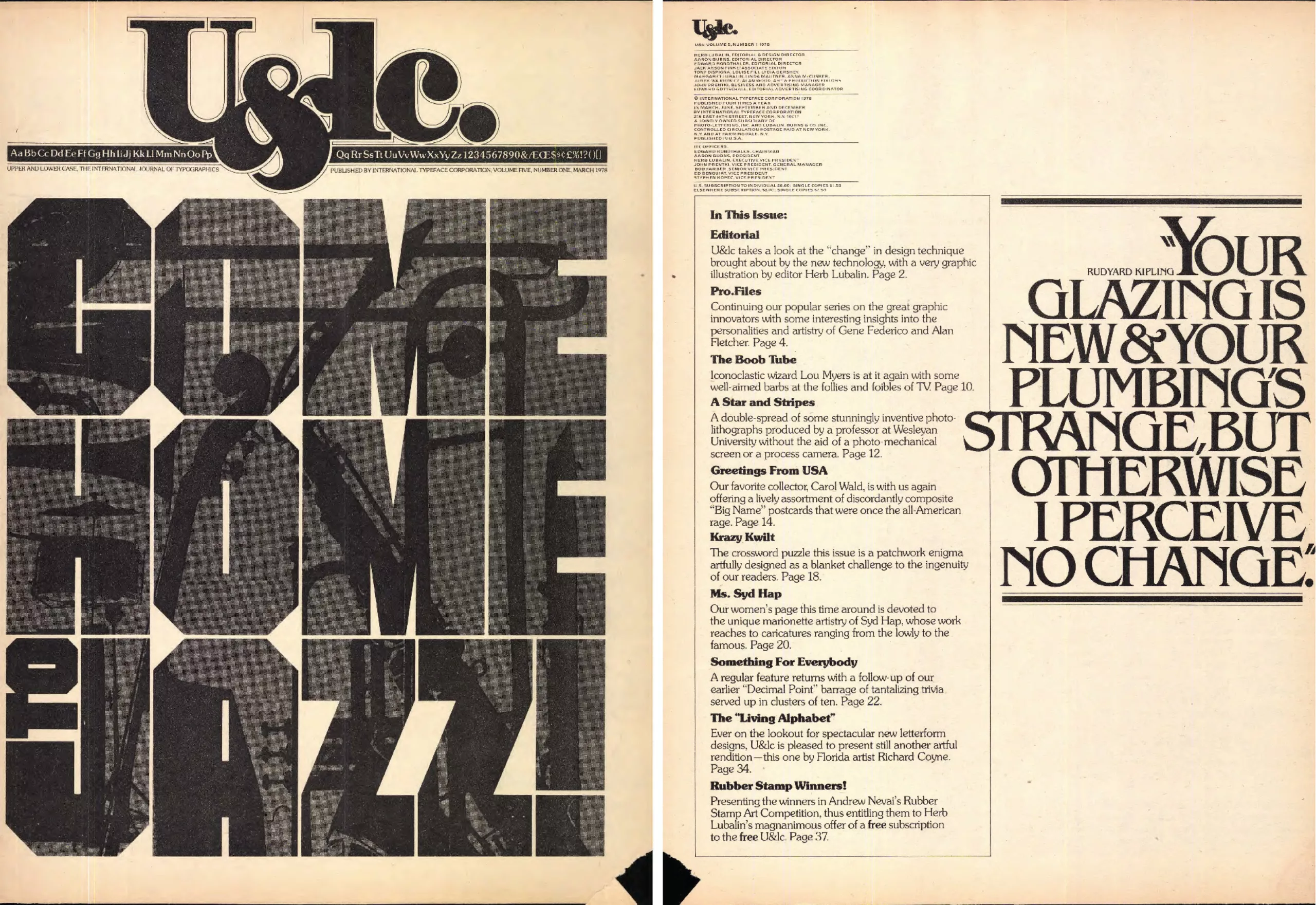 En 1970, 10 ans avant sa mort, Lubalin cofonde avec Burns l’International Typeface Corporation (ITC), la première bibliothèque typographique virtuelle qui se bat également pour une rémunération juste des dessinateurs de caractères, et la revue U&lc (Up & lower case, Majuscules et minuscules) qui l’illustre et dont il est le directeur artistique. L’ITC propose 4x par an aux industriels des nouvelles collections typographiques, et accessoirement les caractères de Lubalin, qu’ils n’ont plus qu’à photographier et fabriquer. C’est un gain de temps considérable. Les nouvelles typographies sont distribuées gratuitement aux 4 coins du monde aux studios, agences et créatifs dans la revue U&lc. Toutes deux donnent le ton à ce nouvel élan typographique mondial qui vient casser les codes du modernisme, en écho avec la libération et l’humanisation de la société face à la montée des critiques de la consommation de masse et de la standardisation. Voici quelques pages du numéro 5 sur le jazz, consultable intégralement par ici.