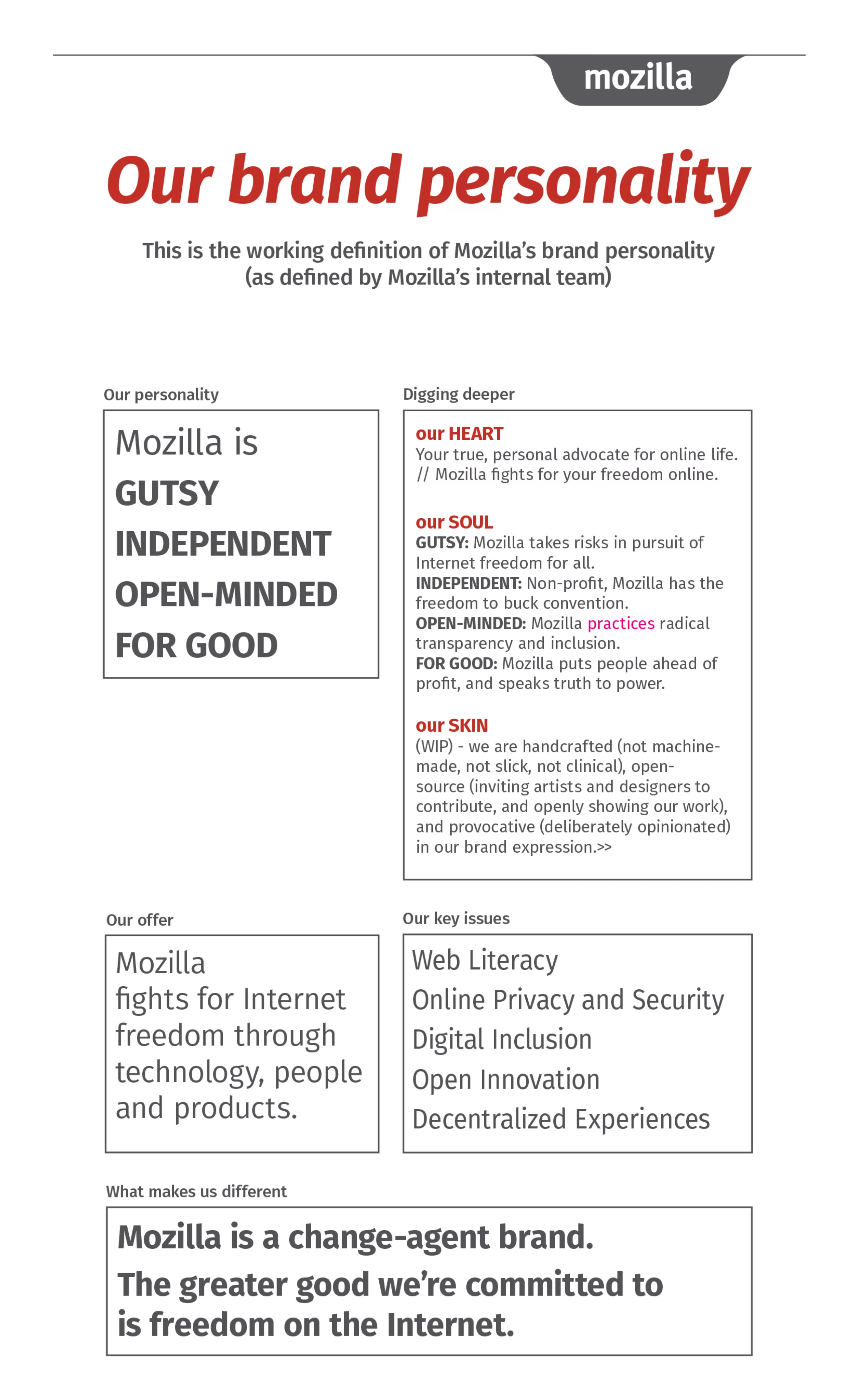 - Refléter le nouveau coeur de personnalité de Mozilla : qui a du cran, indépendant, plein d’entrain, pour la bonne cause
