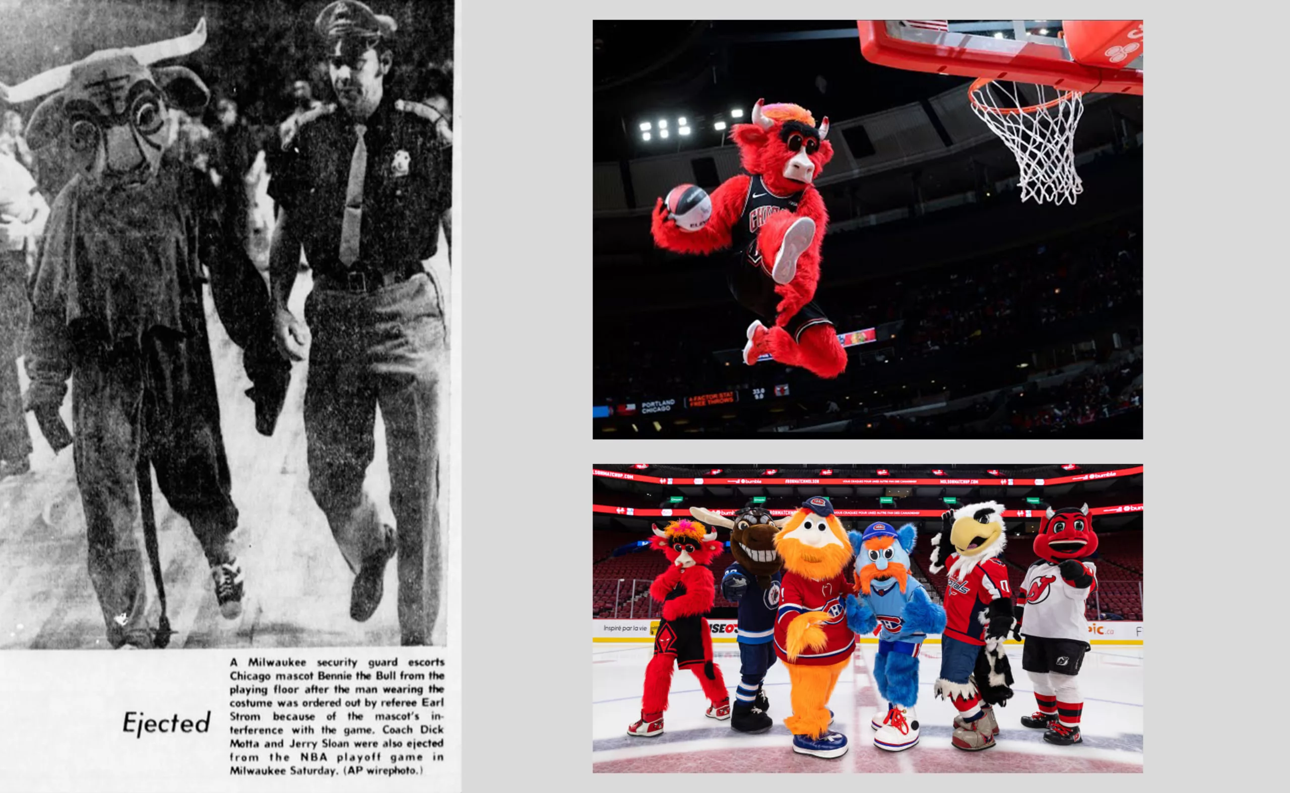 Du côté des sports d’équipe, les mascottes les plus connues évoluent plutôt outre Atlantique au sein de la Fédération de Hockey et de la NBA. Aux États-Unis et au Canada, les mascottes incarnent l’esprit de l’équipe et viennent provoquer les adversaires ou jouer avec le public. Certaines sont de véritables icônes dont l’identité est maintenue secrète, comme l’interprète de Benny the Bull des Chicago Bulls, un véritable acrobate payé 200 000$ par an, hors primes, pour animer les salles et faire plus de 250 apparitions publiques. Un peu comme une Miss France, mais en plus poilue.
