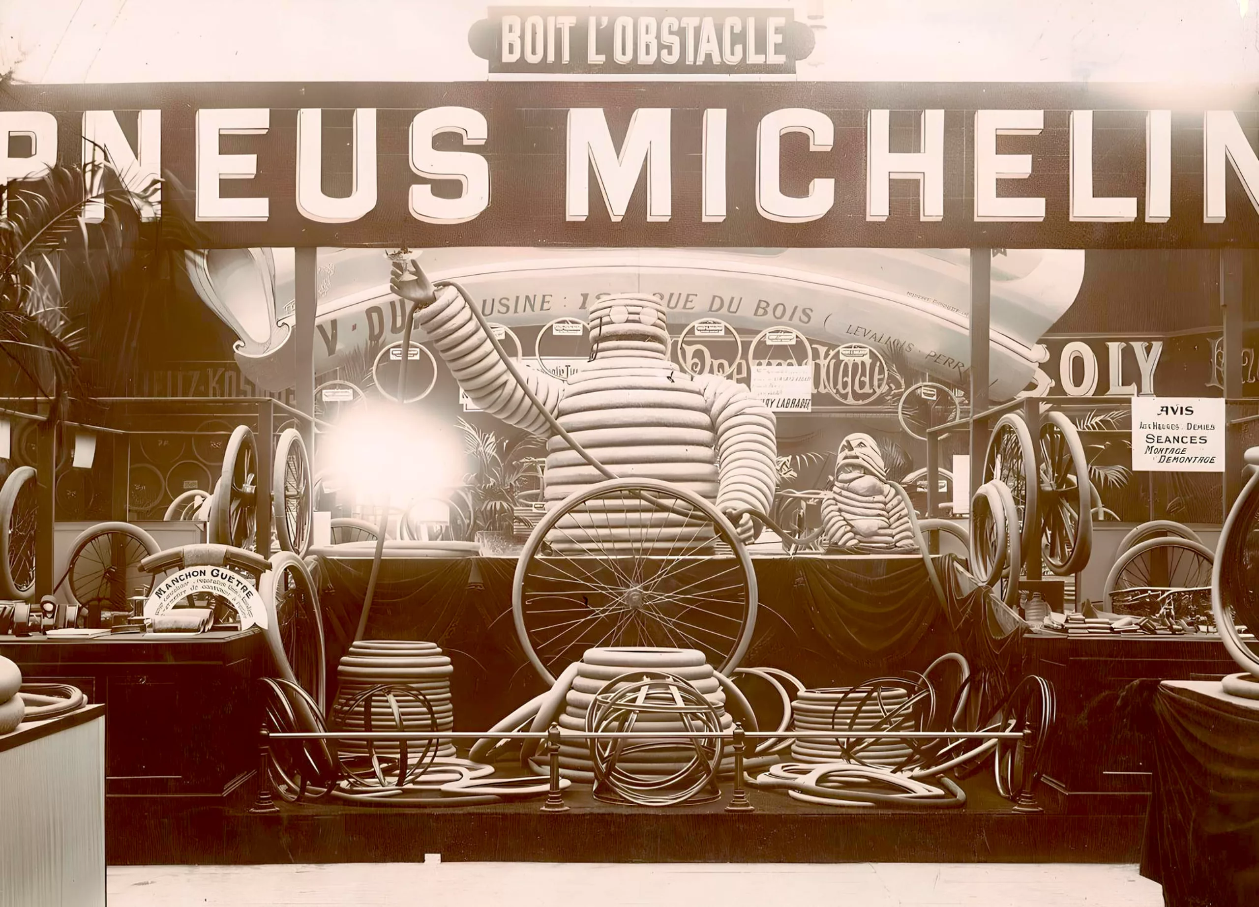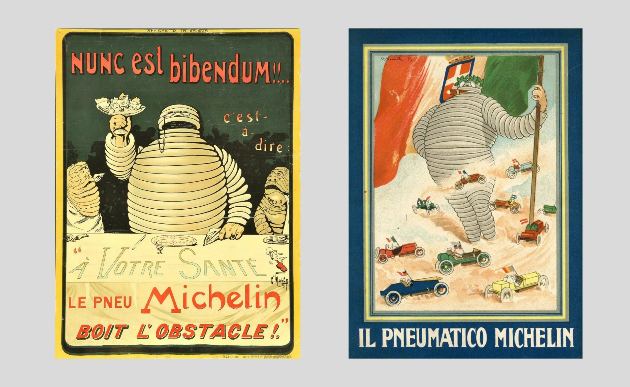 C’est l’illustrateur Marius Rossillon qui lui donnera vie : son nom est emprunté aux Odes du poète Horace, “Nunc est bibendum“ (“c’est le moment de boire”) comme le précise l’affiche, pour dire que “le pneu Michelin boit l’obstacle”, c’est à dire qu’il épouse les creux et les bosses, à tel point que Bibendum est capable d’avaler des bris de verre. À ses côtés, on y voit des “pneu x” flétris et dépités, qui sont clairement loin de tenir la route. Bon vivant, fiable, endurant et robuste, ce génie surgonflé est protecteur et rend service, tout en étant drôle et jovial. Il incarne à la fois les valeurs de l’entreprise et la technicité des pneus.