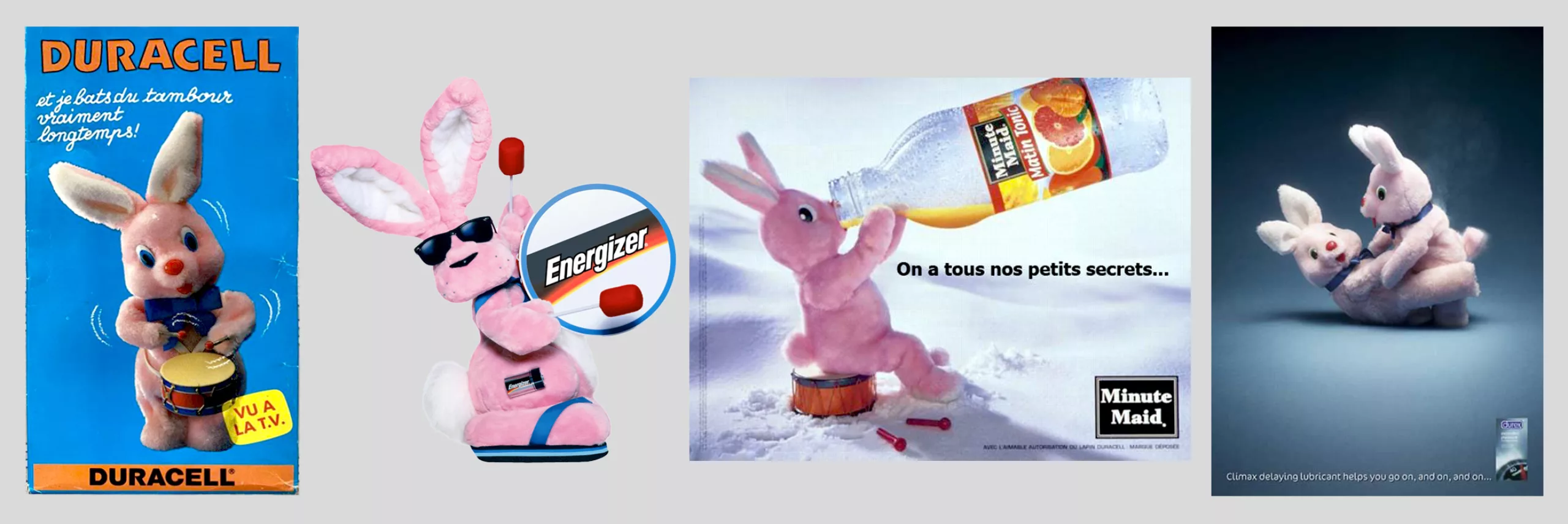Dans les années 2000, Minute Maid utilise la notoriété du lapin rose à son avantage, en dévoilant que le secret de son énergie légendaire ne viendrait pas des piles, mais du fait qu’il boive discrètos du jus de fruit… ! Plus tard, c’est Durex qui sort un lubrifiant retardant la jouissance, pour “durer plus longtemps”, avec les lapins Duracell en stars du X. Décidément…