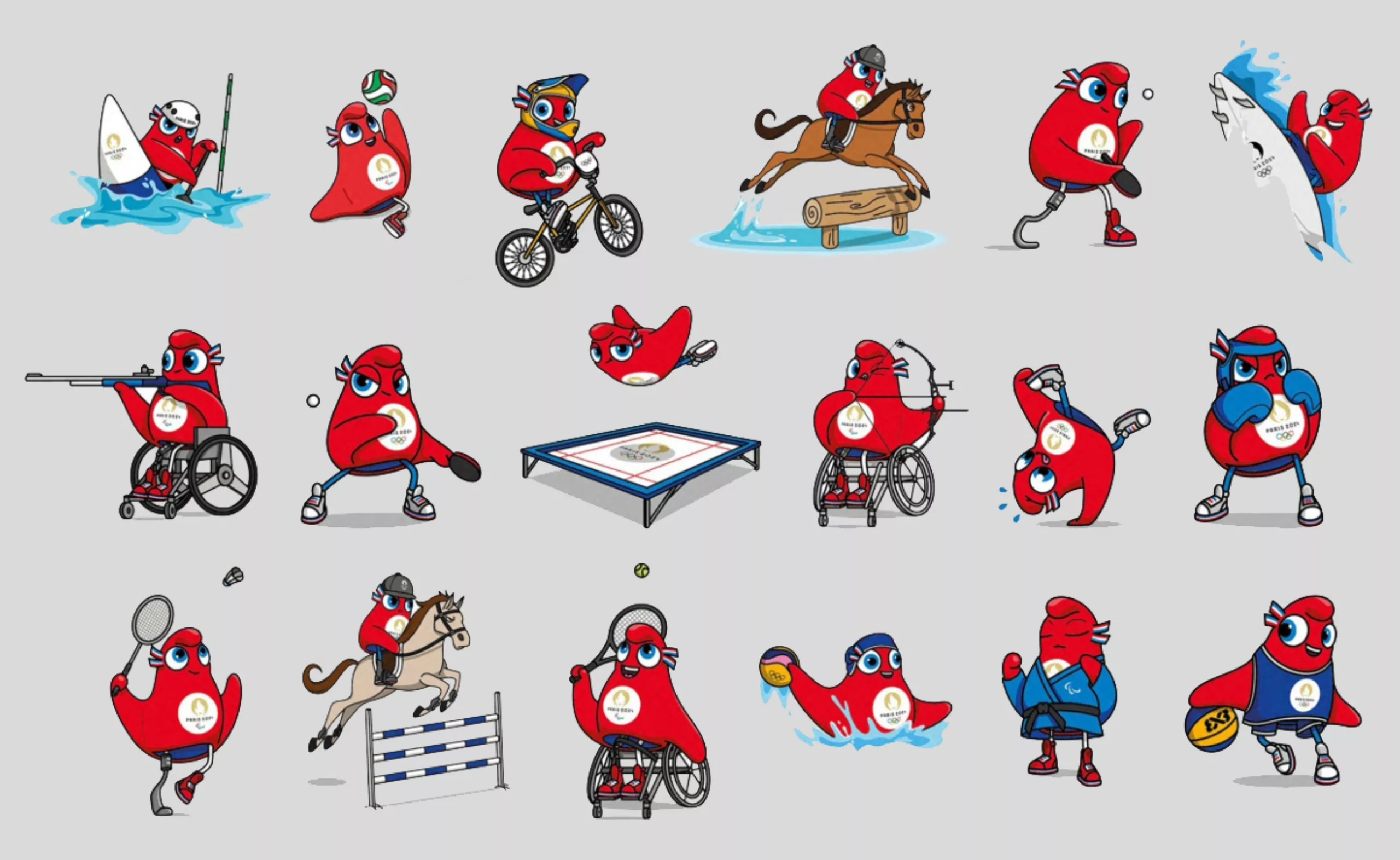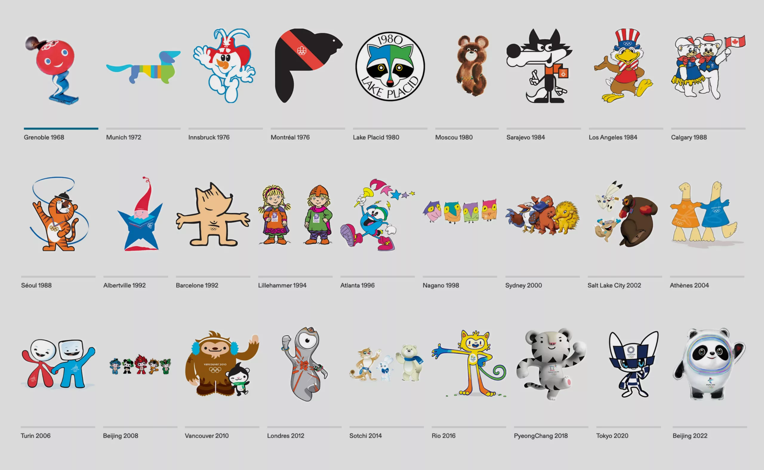Les Phryges se positionnent dans la lignée de mascottes plus ou moins loufoques et mignonnes choisies pour représenter les Jeux, à la suite de quelques formes anthropomorphes parfois indéfinissables (à voir en grand dans l’image ci-dessous) comme le “schuss” de Grenoble en 1968, l’étoile d’Albertville en 92, Izzy la flamme d’Atlanta en 96, ou Wenlock le morceau de stade de Londres en 2012. La majorité des autres mascottes sont inspirées d’animaux. Lors de la précédente édition, en Chine, le panda givré avait eu une cote de popularité immense auprès du jeune public, raffolant de produits dérivés et peluches à son effigie.