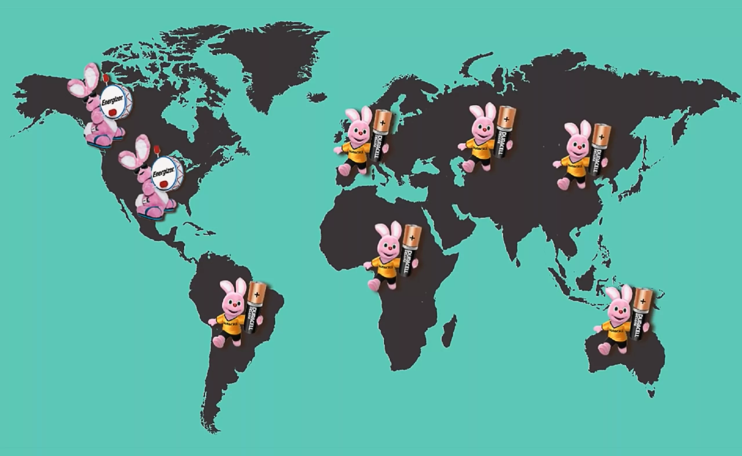 Après un commun accord légal, il est acté que Duracell peut vendre ses piles partout, sauf en Amérique, territoire d’Energizer. Aujourd’hui, on trouve pourtant des Energizer en Europe, mais la mascotte est une pile musclée, pas un lapin rose. Entre lapins, on ne chie pas dans les bottes des autres… surtout quand on porte des tongs ! Question de principes. Autre détail, en Turquie, ce n’est plus un lapin rose mais un ours brun. La mondialisation devient compliquée.