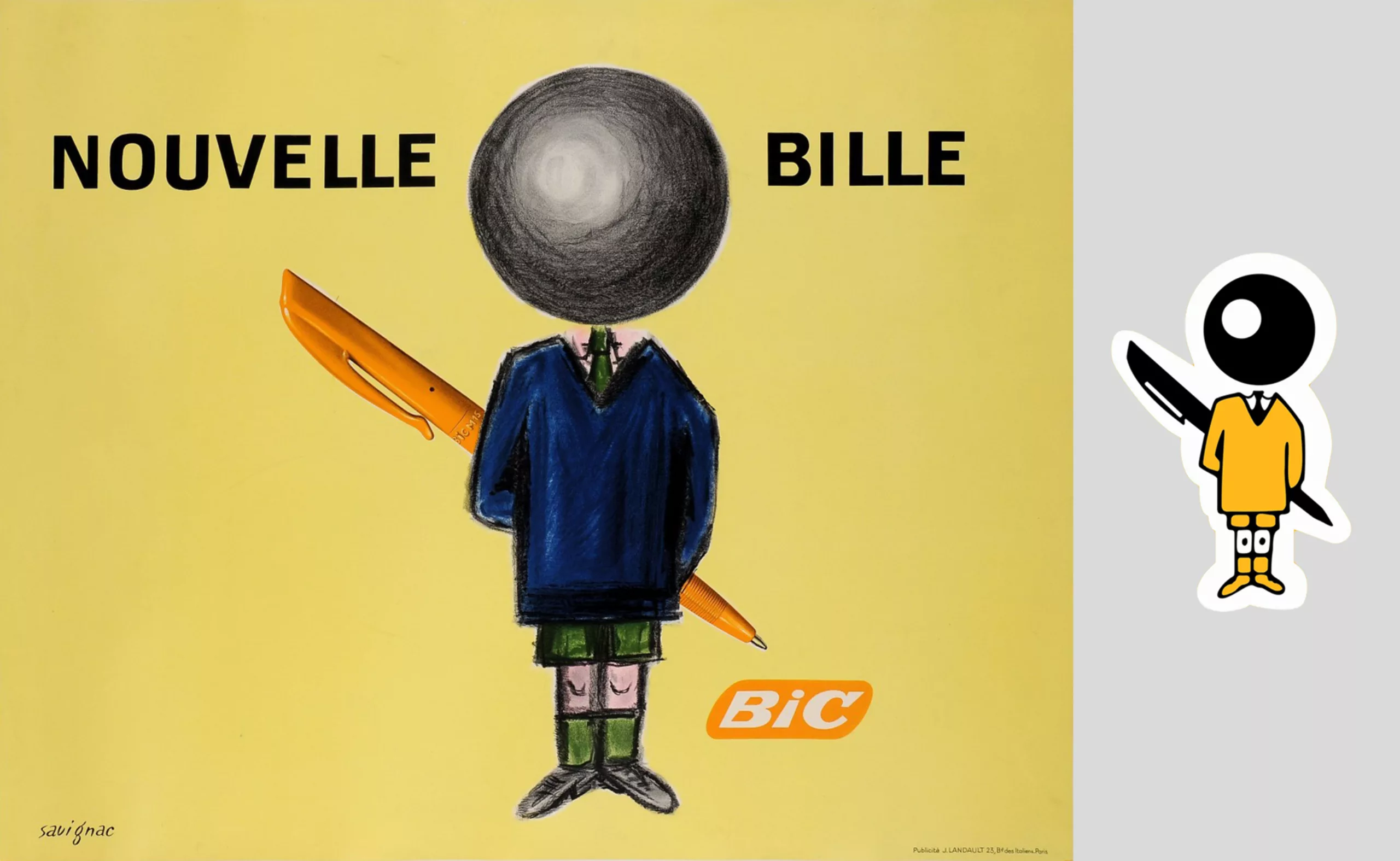 En 1961, le fondateur Bich lance un nouveau stylo avec une nouvelle bille innovante, et Savignac a l’idée de dessiner un bonhomme (un écolier) à tête de bille, ronde et disproportionnée. Si le stylo ne remplacera la plume sur les bancs de l’école que 4 ans plus tard, l’écolier à grosse tête n’est pas là pour anticiper ce succès mais plutôt choisi pour ses symboles : la bille a toujours été un jeu populaire des cours de récré, en plus d’être synonyme de “tête”.