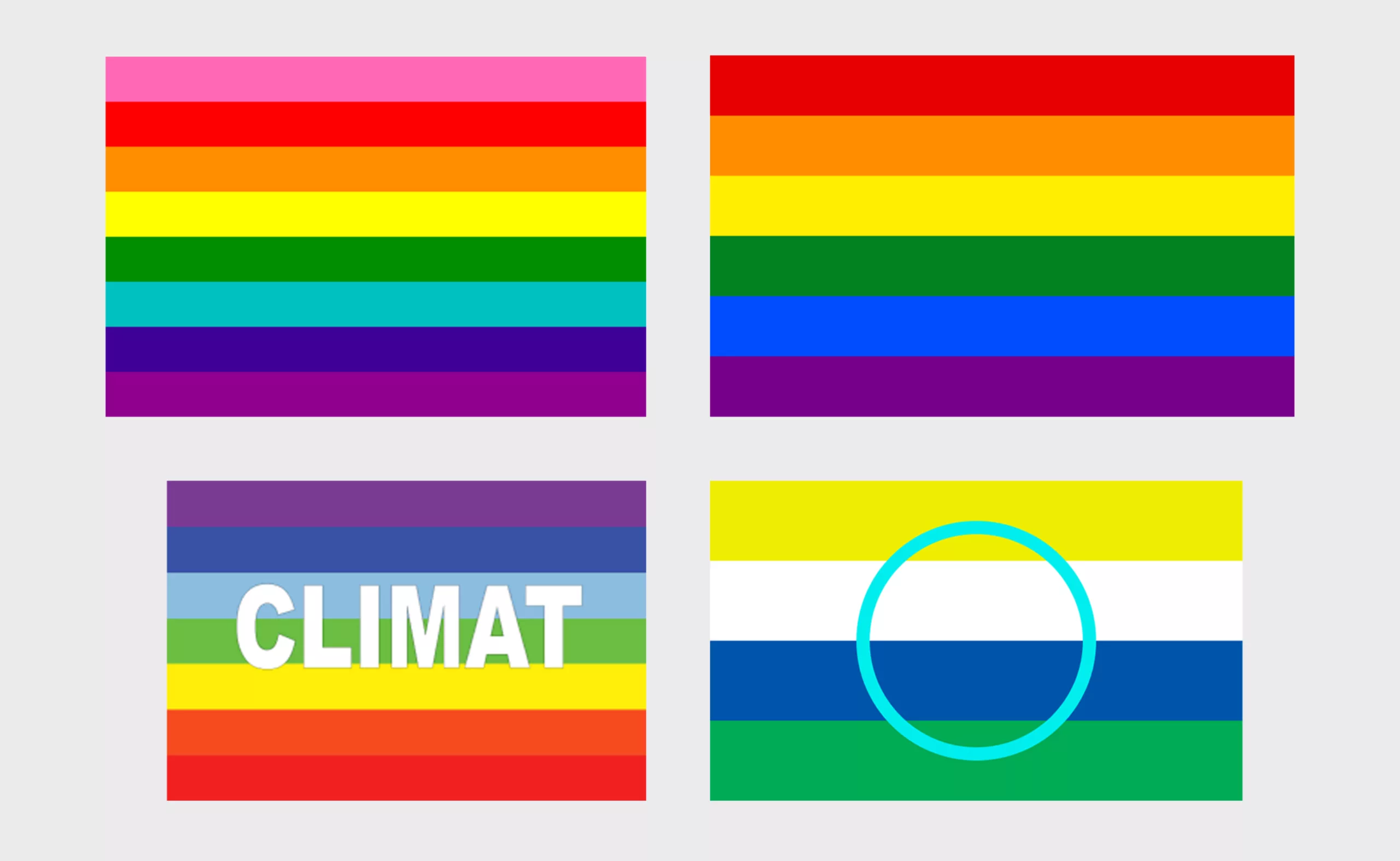 Le rose pour la sexualité, le rouge pour la vie ou la Terre nourricière, l’orange pour la fierté ou la guérison, l’intelligence ou la culture, le jaune pour le soleil, l’énergie et la force, le vert pour la nature, la production, le turquoise pour la magie et l’art, le bleu pour l’espace, la sérénité, et le violet pour l’esprit, la spiritualité. L’étendard arc-en-ciel a été décliné plus récemment en drapeaux du climat (Climate flag) en bas sur l’image ci-dessous.