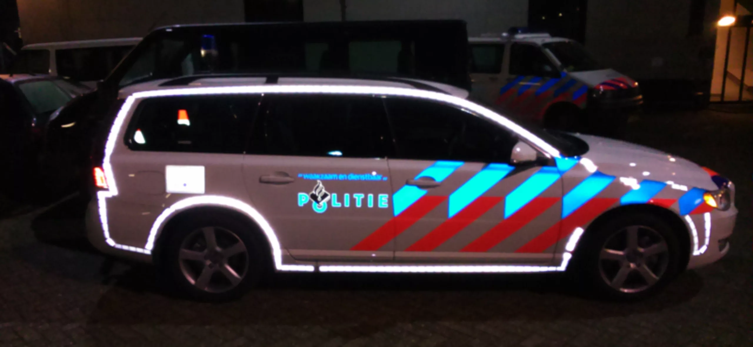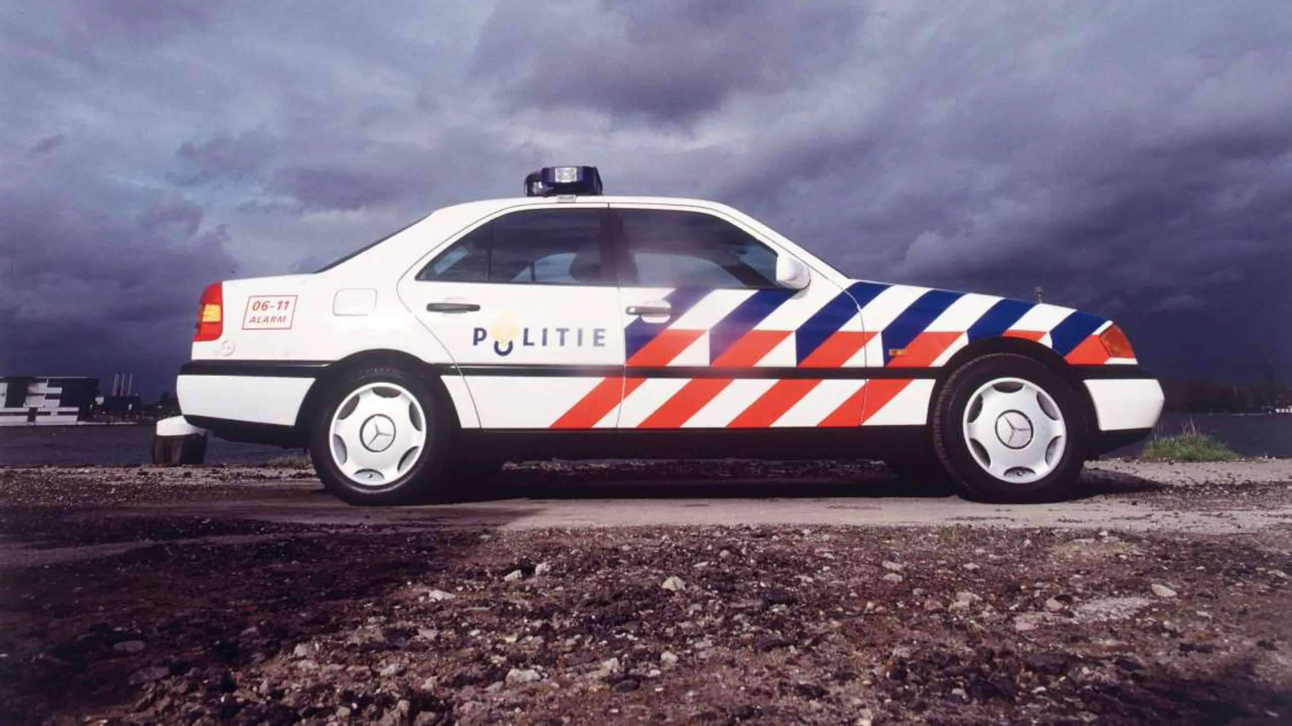 Il s’agit des “rayures BZK”. BZK pour “Ministerie van Binnenlandse Zaken” ( Ministère de l’Intérieur). C’est un projet commandé en 1992 par le ministère pour renforcer la visibilité des véhicules de Police. C’est le fameux Studio Dumbar qui se voit confier cette tache. Très vite, le succès de ce design est au rendez-vous, et l’ensemble des véhicules d’urgences ( pompier, ambulances…) en est aujourd’hui équipé.