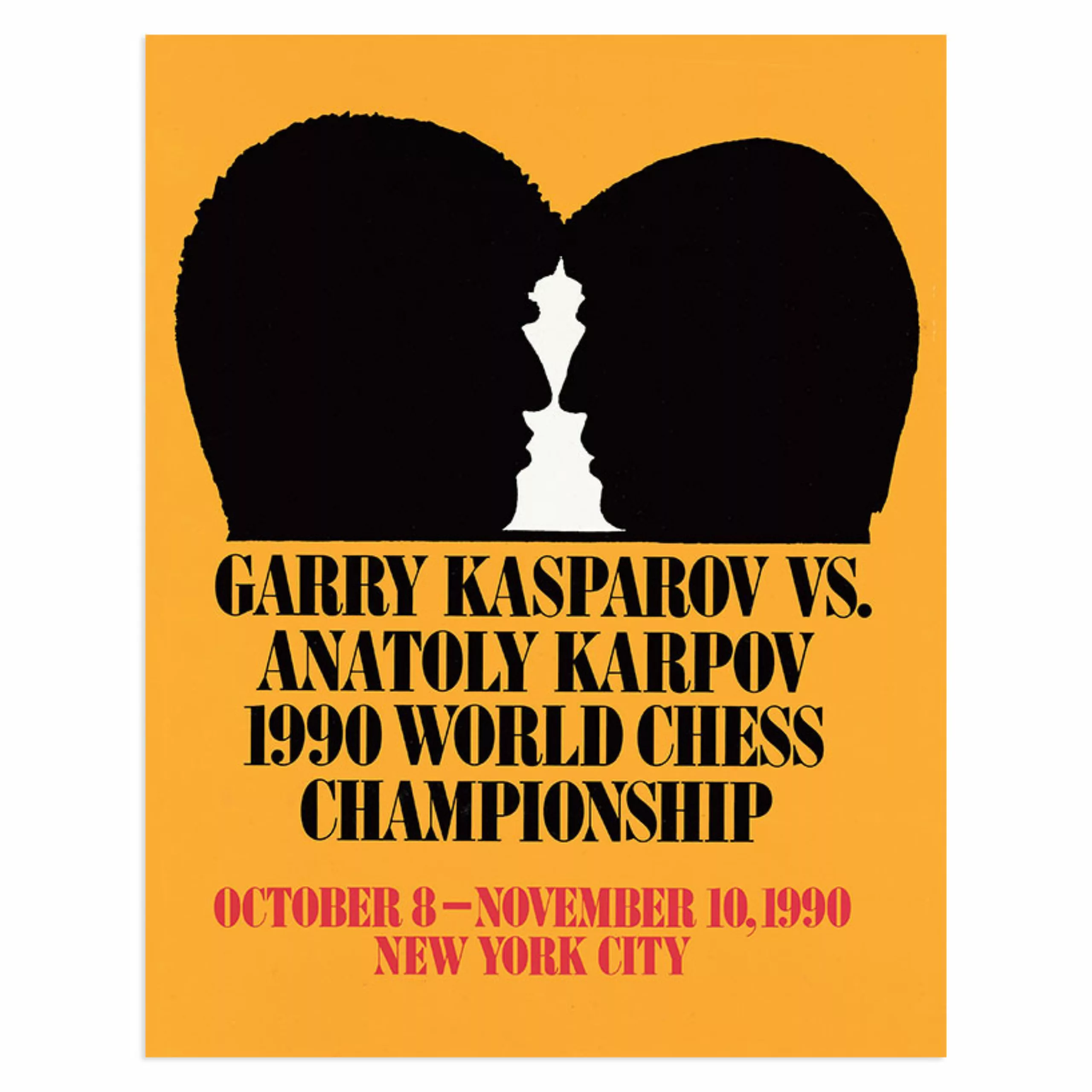 Dans l’esprit “affiche coup de poing” cela nous fait un peu penser à celle imaginée par George Lois en 1990 dans laquelle les profils de Kasparov et Karpov révélaient le Roi. Un événement qui marquera longtemps nos esprits car, comme l’a dit Coluche, “si la victoire est brillante, l’échec est mat.“
