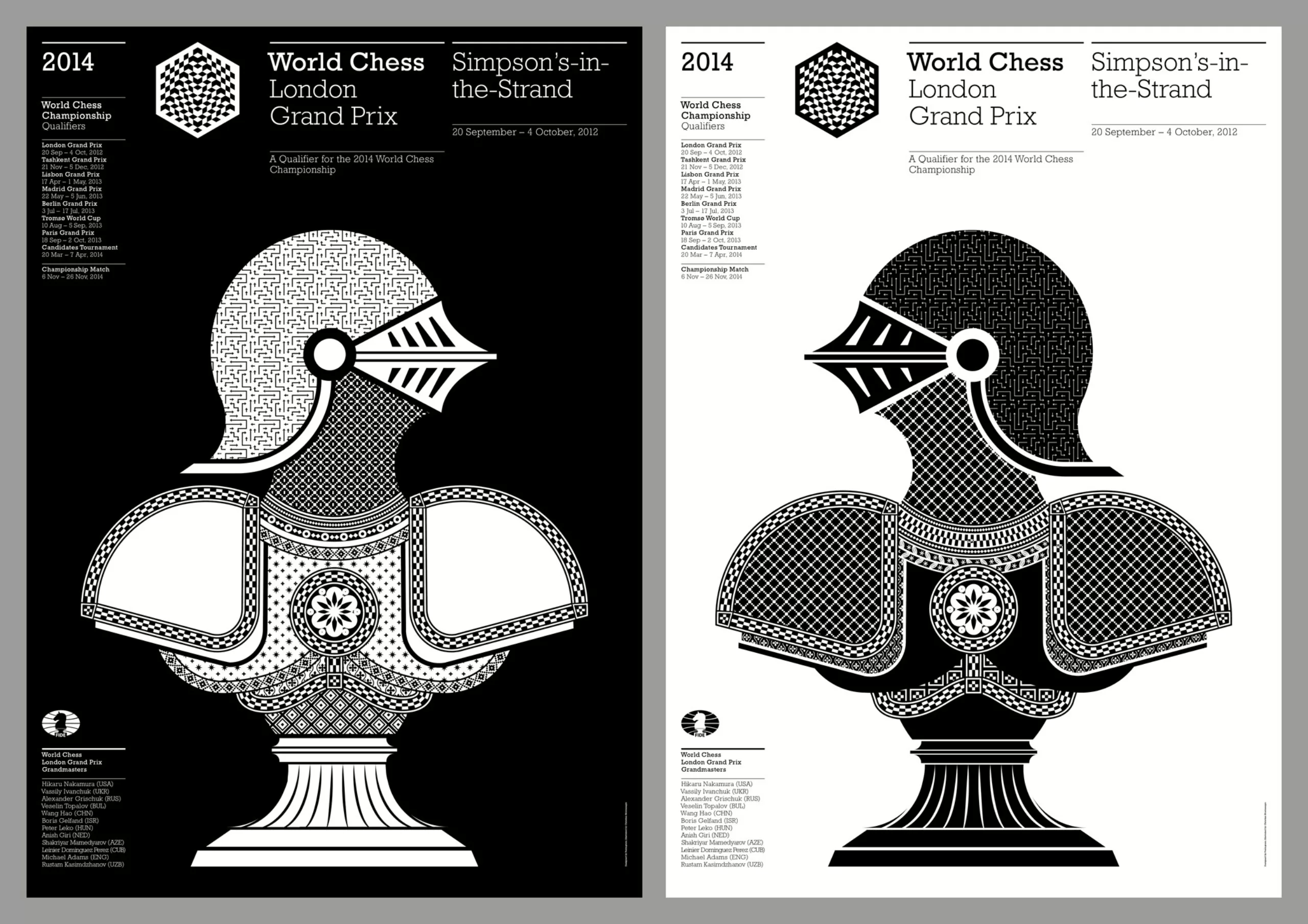 En 2016, l’agence avait repris les “reines” (blague) en proposant de nouvelles affiches pour l’édition de New York à partir du délicieux travail de Pentagram, à qui l’on doit l’identité du championnat depuis l’acquisition des droits par l’entrepreneur Andrew Paulson, en 2011. Bâtie en noir et blanc dès son origine, couleurs de contraste et d’opposition qui reflètent l’état d’esprit du jeu, l’identité du “World Chess” avait été déclinée jusque dans le design d’objet avec la création de tables et d’espaces de jeu.