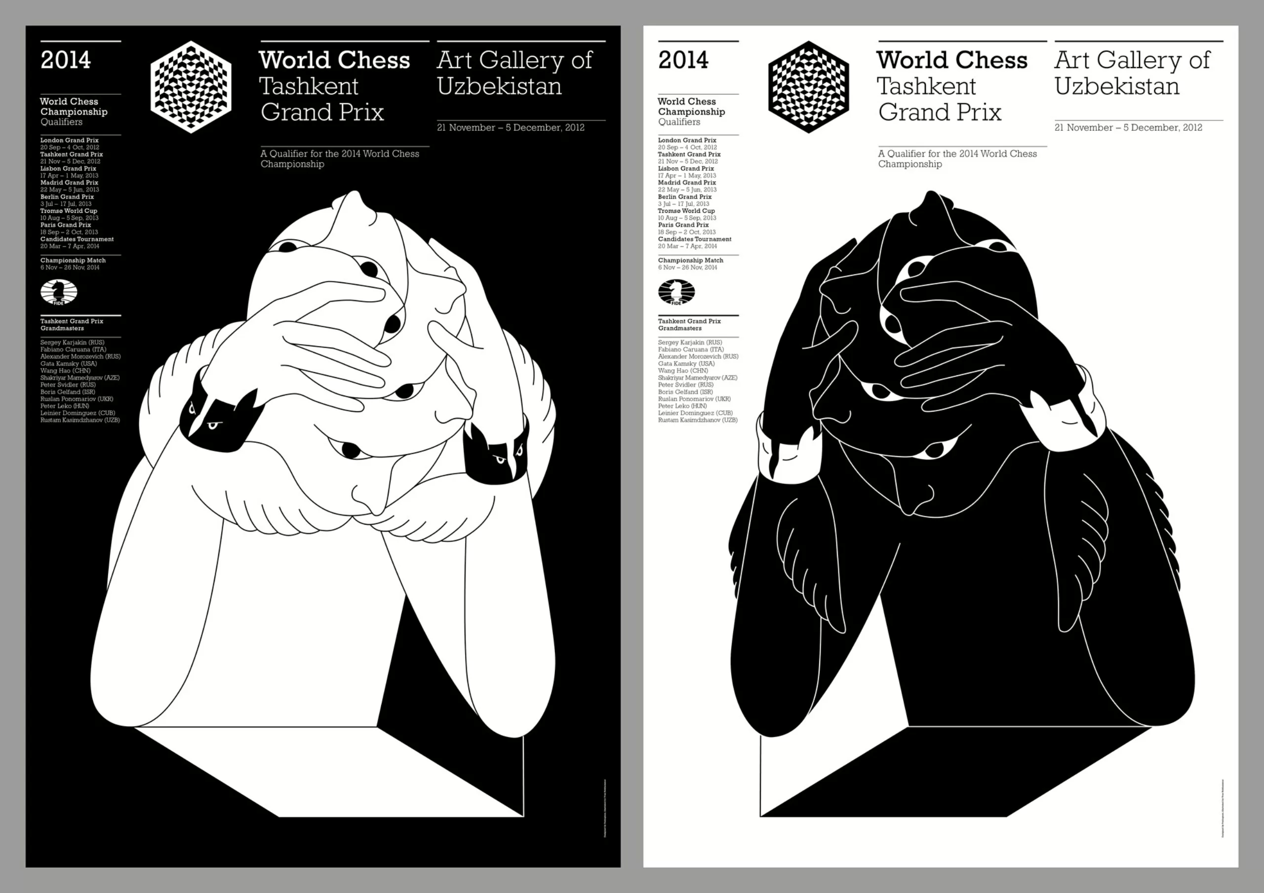 Ce visuel “controversé et branché” comme la ville hôte, représente deux joueurs d’échecs emmêlés qui font des pieds et des mains pour placer leurs pions. Minimaliste et en noir et blanc, l’affiche a déjà fait couler beaucoup d’encre, surtout sur les réseaux sociaux où l’on l’a qualifiée de “pawnographic” (pawn signifiant pion en anglais). Illustrée et conçue par Koltsov, DA et illustrateur de l’agence Shuka, elle pourrait aussi bien être un clin d’oeil à la page du crocodile du Codex Seraphinianus qu’aux tableaux de Vasarely.
