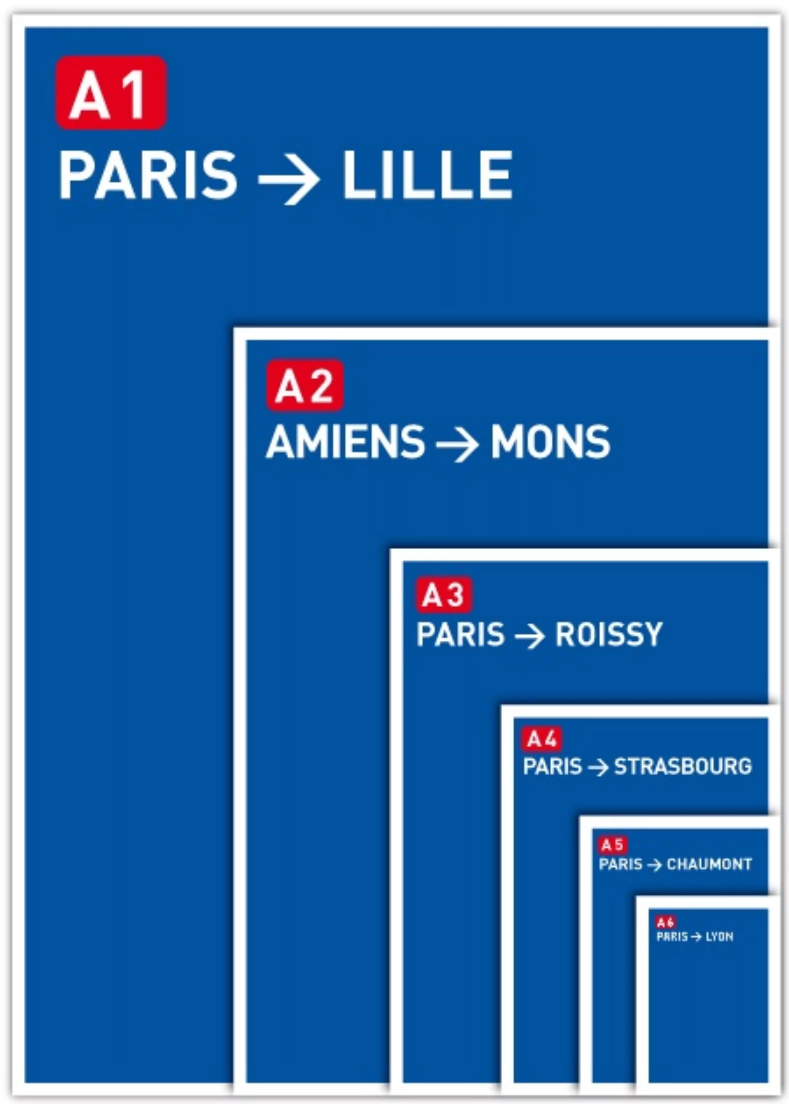 Un petit tour de France des formats de papiers… A force de croiser un panneau routier m’indiquant la direction de l’autoroute A6, je me suis mis à imaginer un format de papier A6. Et puis par curiosité, je me suis demandé quels seraient les autres destinations des formats A5, A4, A3,