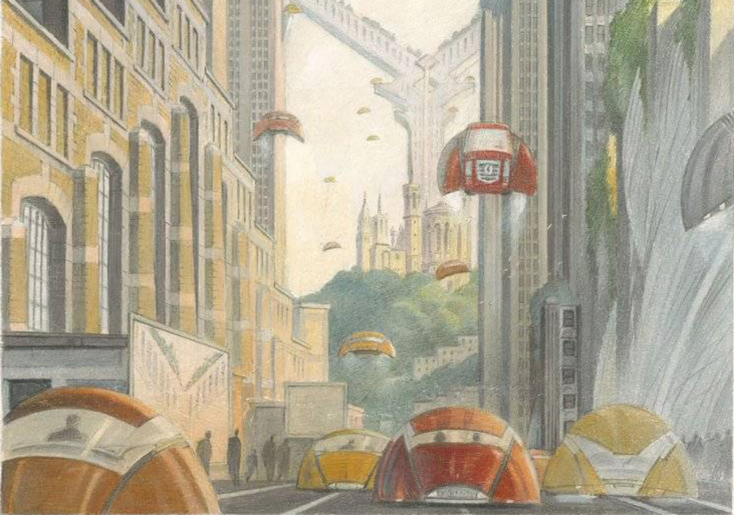 Il est question du réchauffement climatique faisant dériver les icebergs jusque en Egypte, de déchets surabondants et du casse-tête de leur recyclage qui devient un métier extrêmement prisé… On retrouve des villes verticales à l’extrême comme Lyon (image ci-dessous, à gauche, puis les 2 suivantes pour les détails), ou végétalisées dans des serres géantes entretenues par des laveurs de vitres milliardaires, aux rues couvertes d’autoroutes ou d’engins volants.