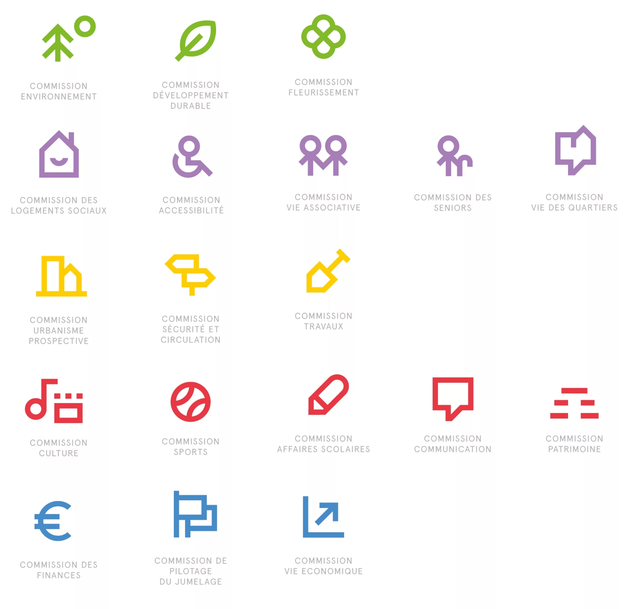 Afin d’identifier les différentes commission de la ville, nous avons conçu pour chacune un pictogramme.