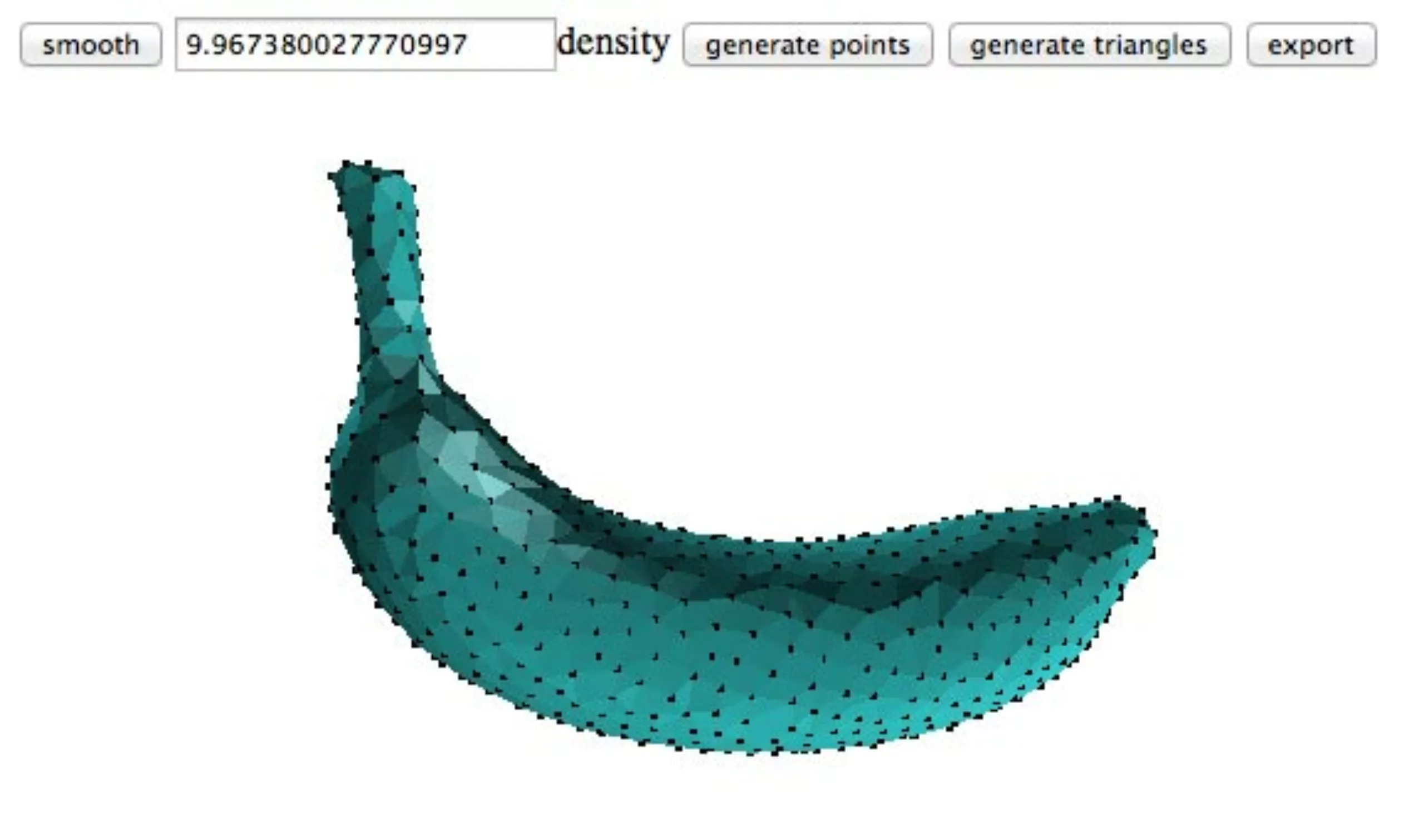 Ensuite on va réduire la résolution du modèle 3D. On va donc utiliser cet outil en ligne : http://n-e-r-v-o-u-s.com/projects/remesh/ ( sous Chrome de préférence, ça bug sous safari… ). En chargeant notre fichier obj, on va donc découvrir notre banane full-res.