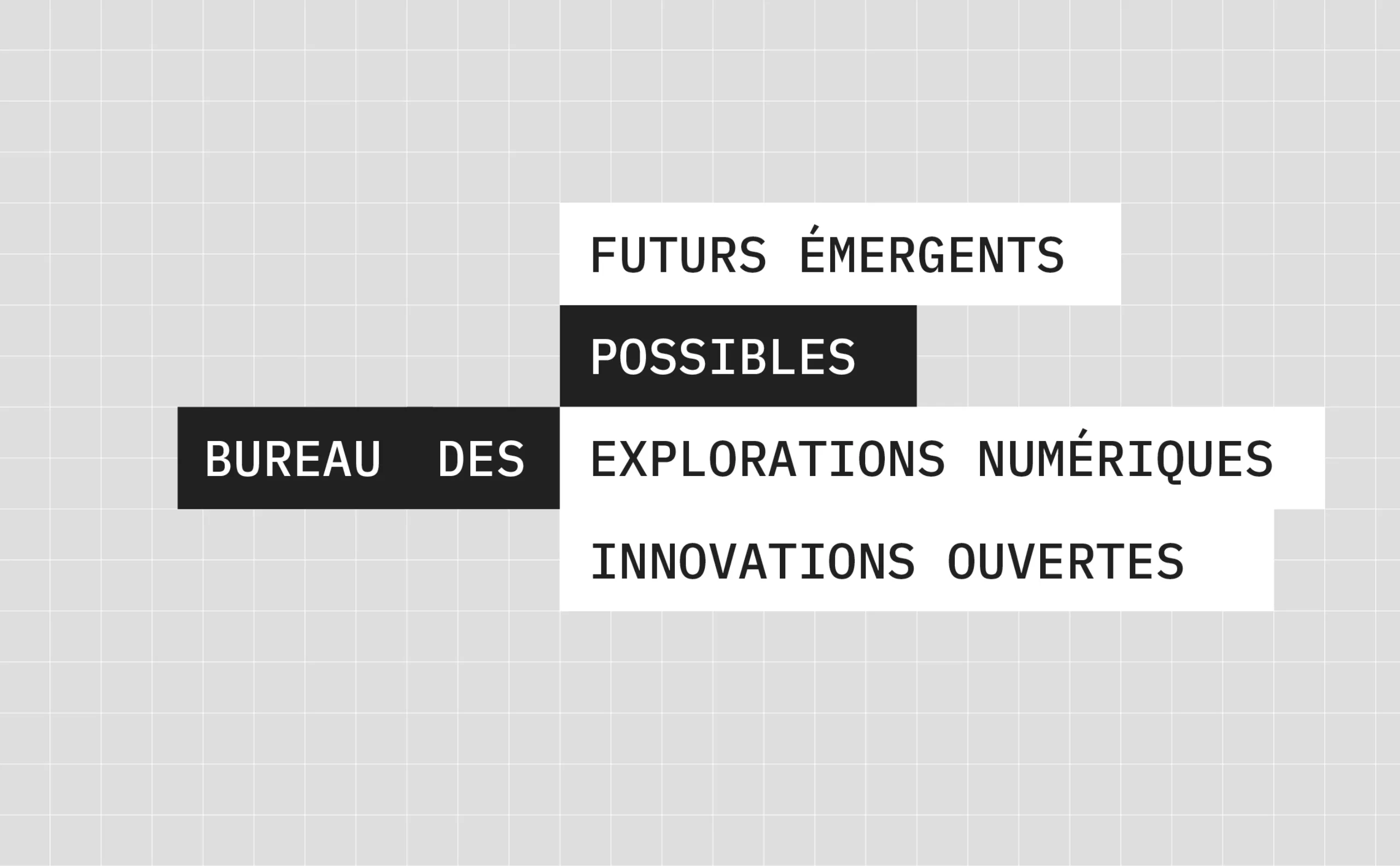 Le logo est conçu dans l’esprit des petites “étiquettes noires” que l’on pouvait imprimer pour organiser les dossiers de bureau. Derrière cette image, il y a l’idée d’un sytème graphique très simple, inscrit dans une grille, bien rangé avec un petit esprit “bureautique”. Il s’agit de créer du contraste avec le système visuel génératif. Les trois blocs du logo peuvent s’articuler de toutes les façons possibles.