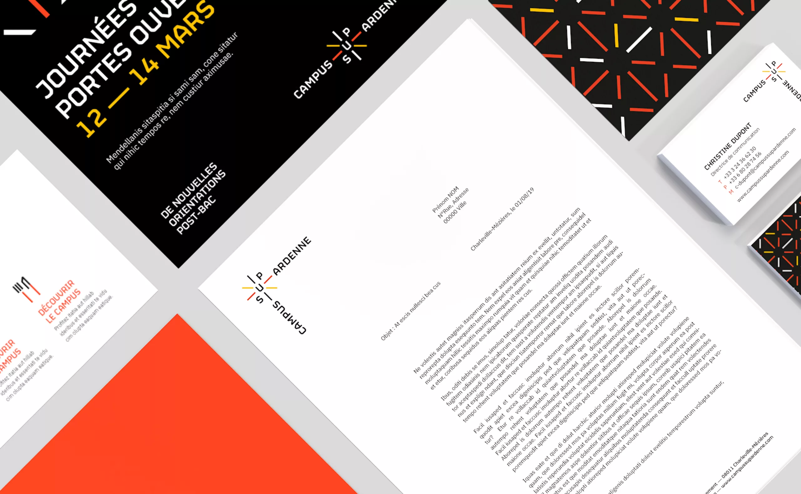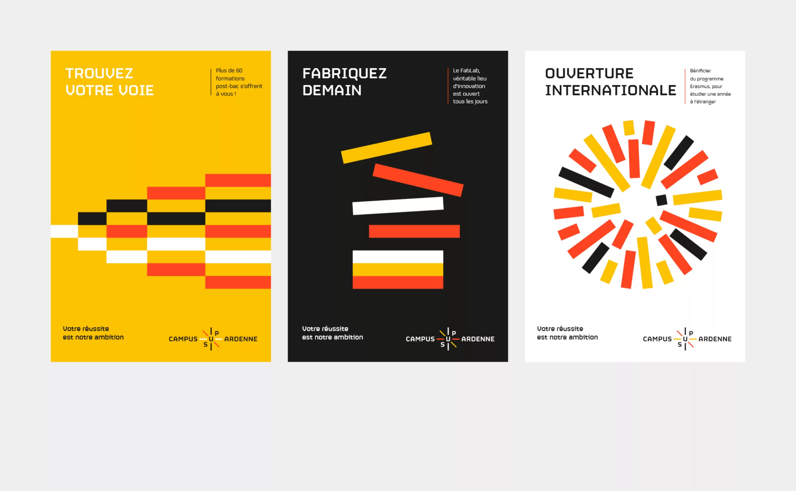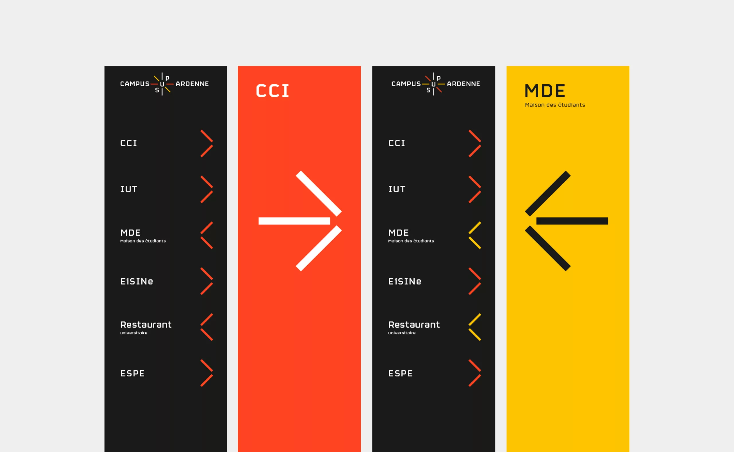 La gamme de couleurs fait expressément référence à l’ambition transfrontalière du campus. En effet, la position stratégique de Charleville-Mézières au cœur de l’Europe septentrionale trouvera assurément un écho positif auprès des étudiants belges, allemands et luxembourgeois.