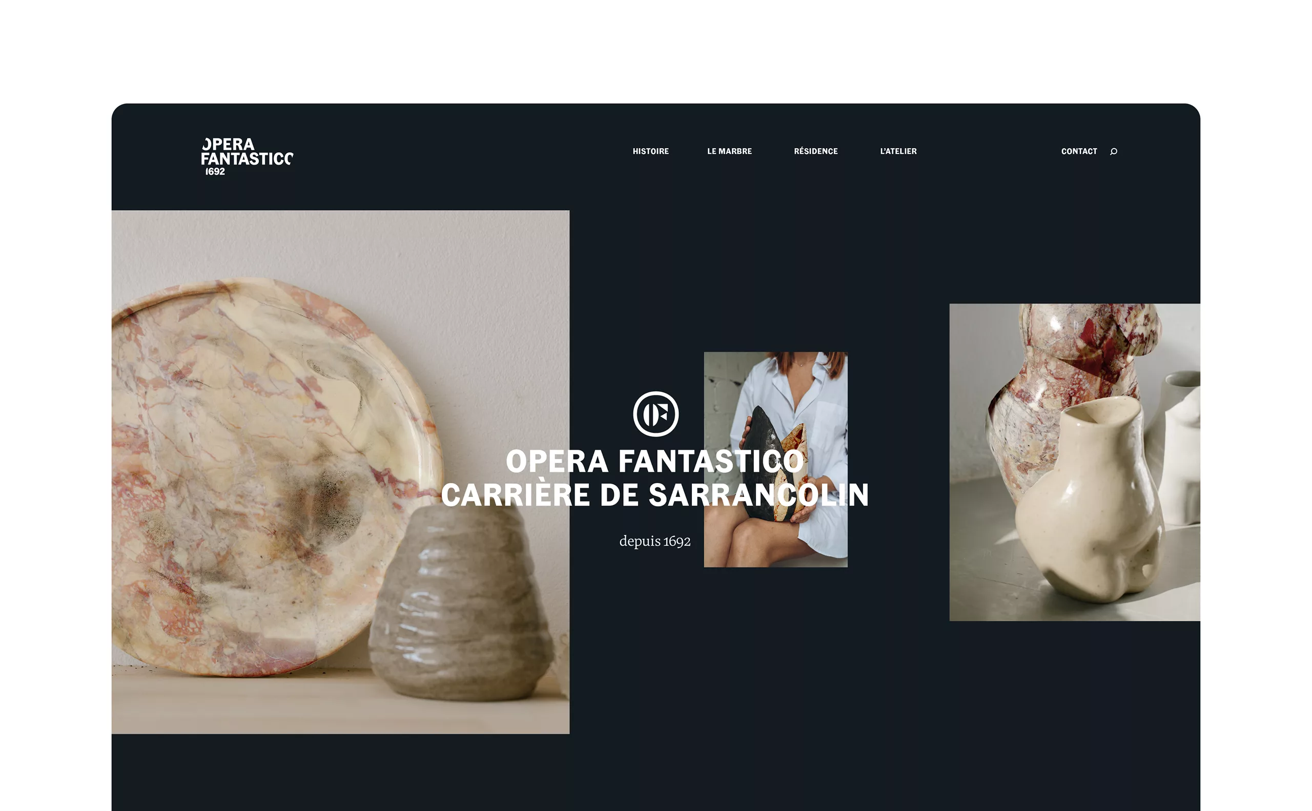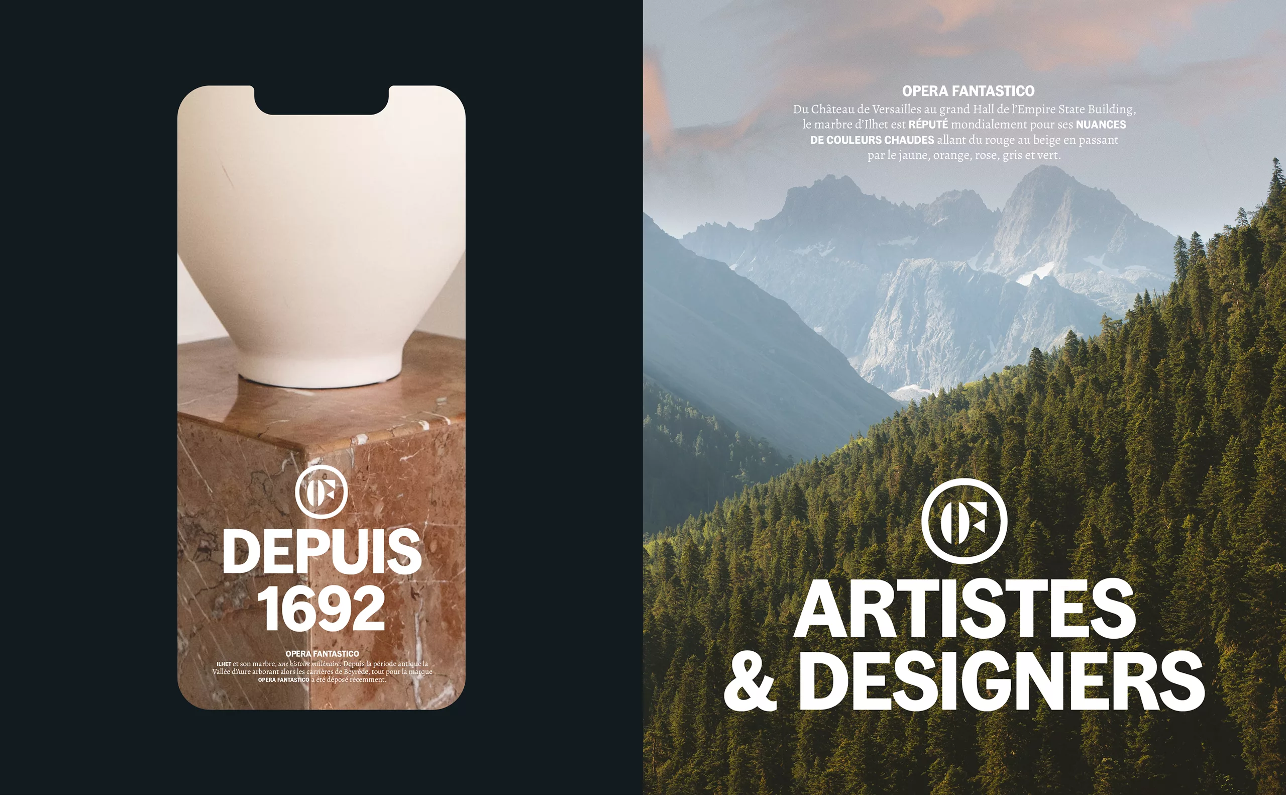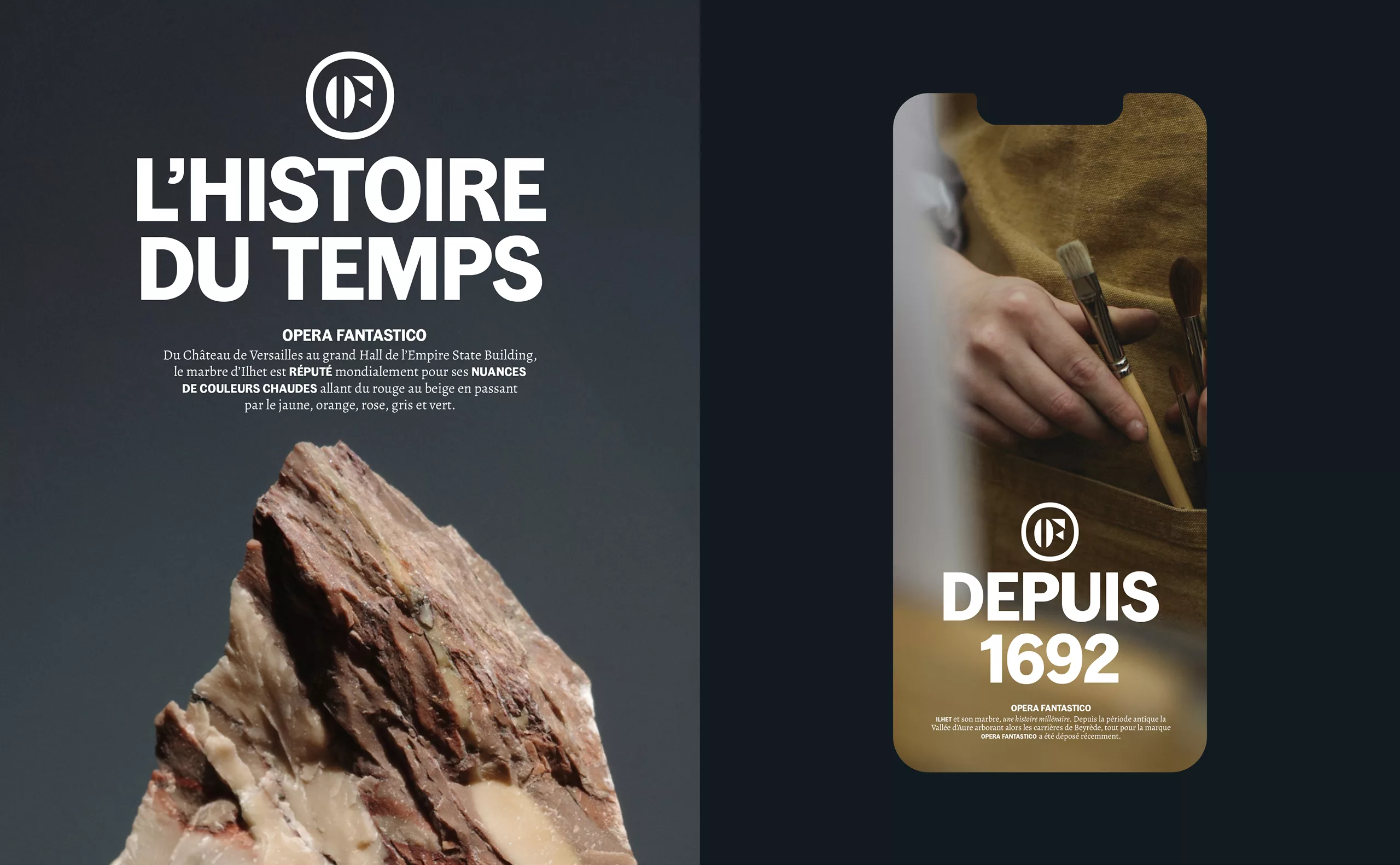 Nommé ainsi à l’époque de Louis XIV, le marbre d’Ilhet porte dorénavant la marque Opéra Fantastico. Cette marque « produit » a pour vocation de faire rayonner le village d’Ilhet et son marbre à travers le monde. Au cœur du village d’Ilhet, l’Atelier des Marbres est un lieu de création, d’exposition et de pédagogique. On y découvrir les savoir-faire autour du marbre. L’Atelier est également un café et une résidence d’artistes, où designers et créateurs se côtoient. Pour renforcer l’unité et la cohérence entre les deux identités, nous avons fait le choix de codes graphiques communs.