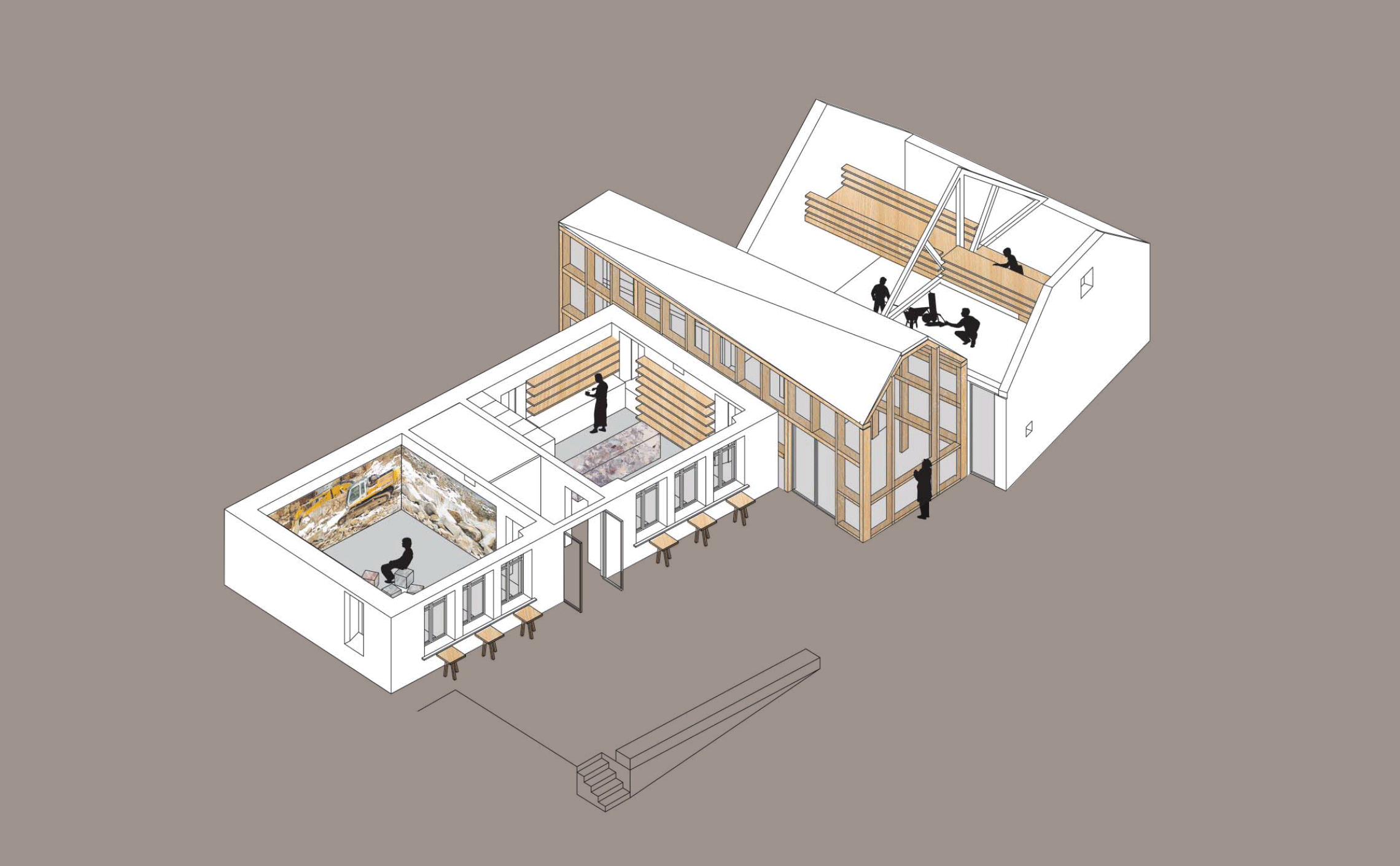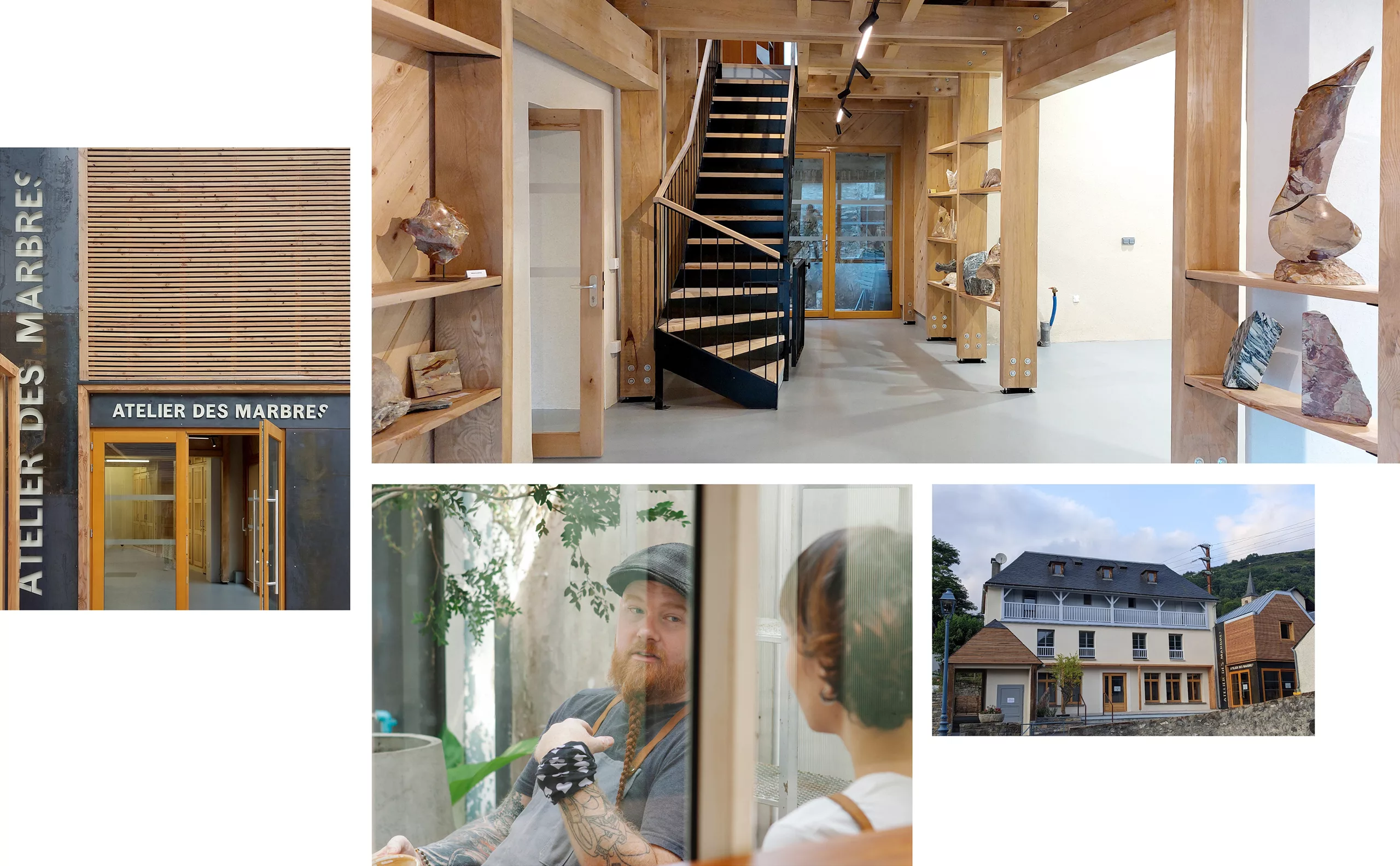 L’emblème de l’atelier des marbres est lui une représentation astucieuse de l’atelier vue du dessus. L’atelier s’est construit autour d’une ancienne école du village. Les adaptations du bâtiment ont données naissance à un espace atypique, pensé et tourné vers la montagne.