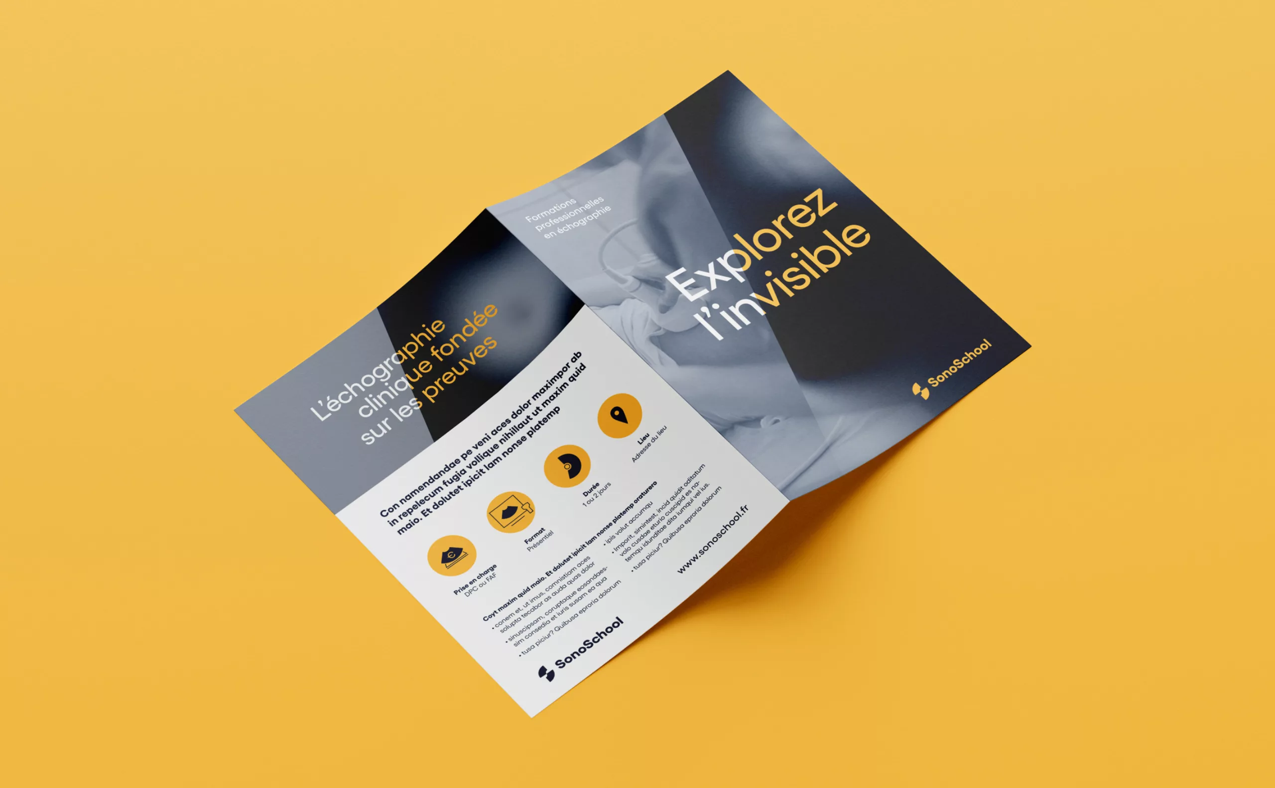ÉducationPositionnement stratégique et création de l’identité de marque de SonoSchool, une école qui forme les professionnels de santé à l’échographie.
