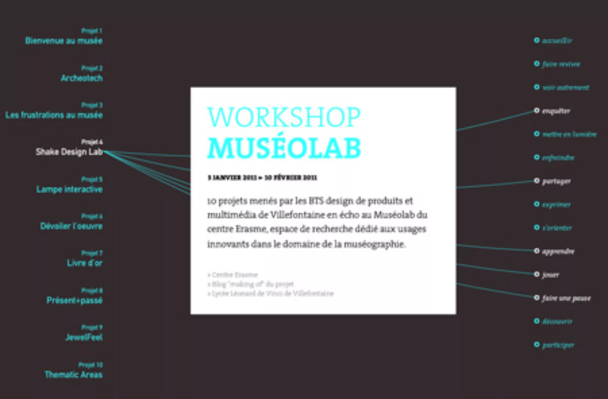 Projet Muséolab mené l’année dernière en binômes BTS design produits/ BTS multimédia avec le centre Erasme (musée et nouvelles technologies) autour des usages innovants dans le domaine de la muséographie. Découvrez les 10 projets ici > http://museolab.pixelpoivre.net/expo/