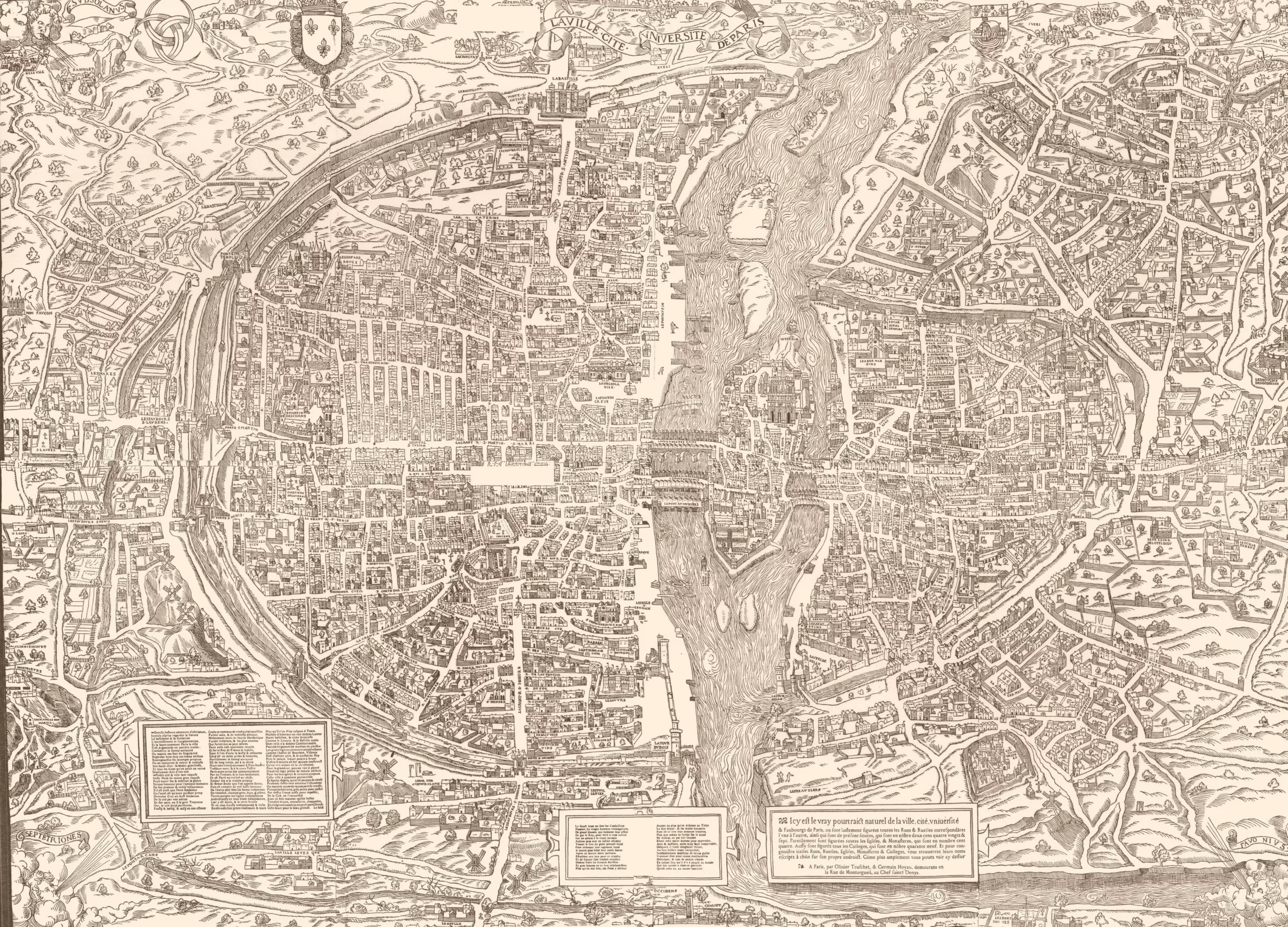 Il faut dire que la représentation circulaire de Paris ne date pas d’hier (probablement parce que c’est sa forme géographique, habile). En 1552, Truchait dessinait un Paris ovale traversé par la Seine.