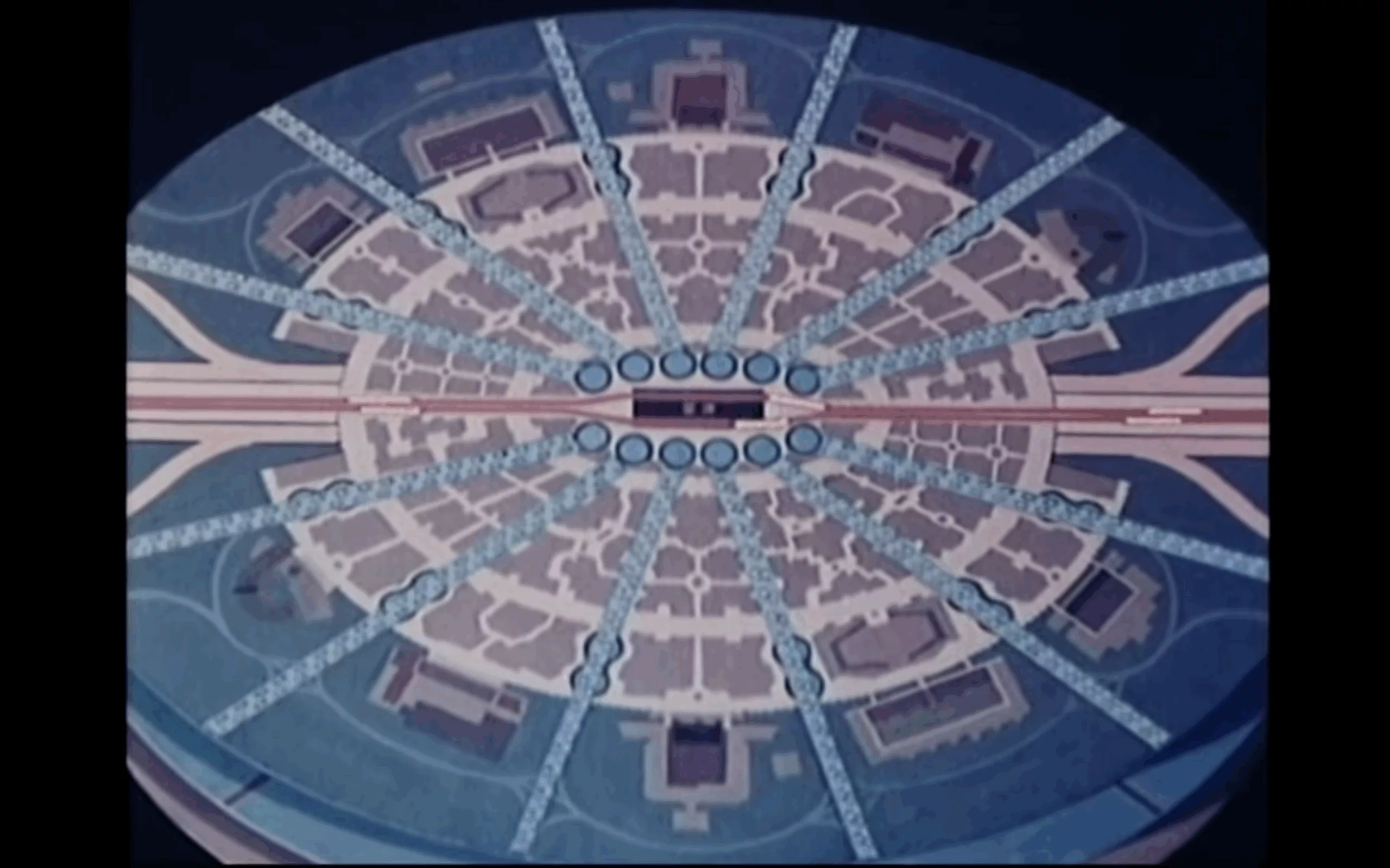 Le résultat futuriste fait penser aux plans de cités utopistes, et notamment à EPCOT, la cité idéale imaginée par Walt Disney. Ce projet abandonné à sa mort et inspiré de l’idéal de vie américain combinait travail, vie et divertissement. On en voit plus dans ce film, à partir de la 10 ème minute.