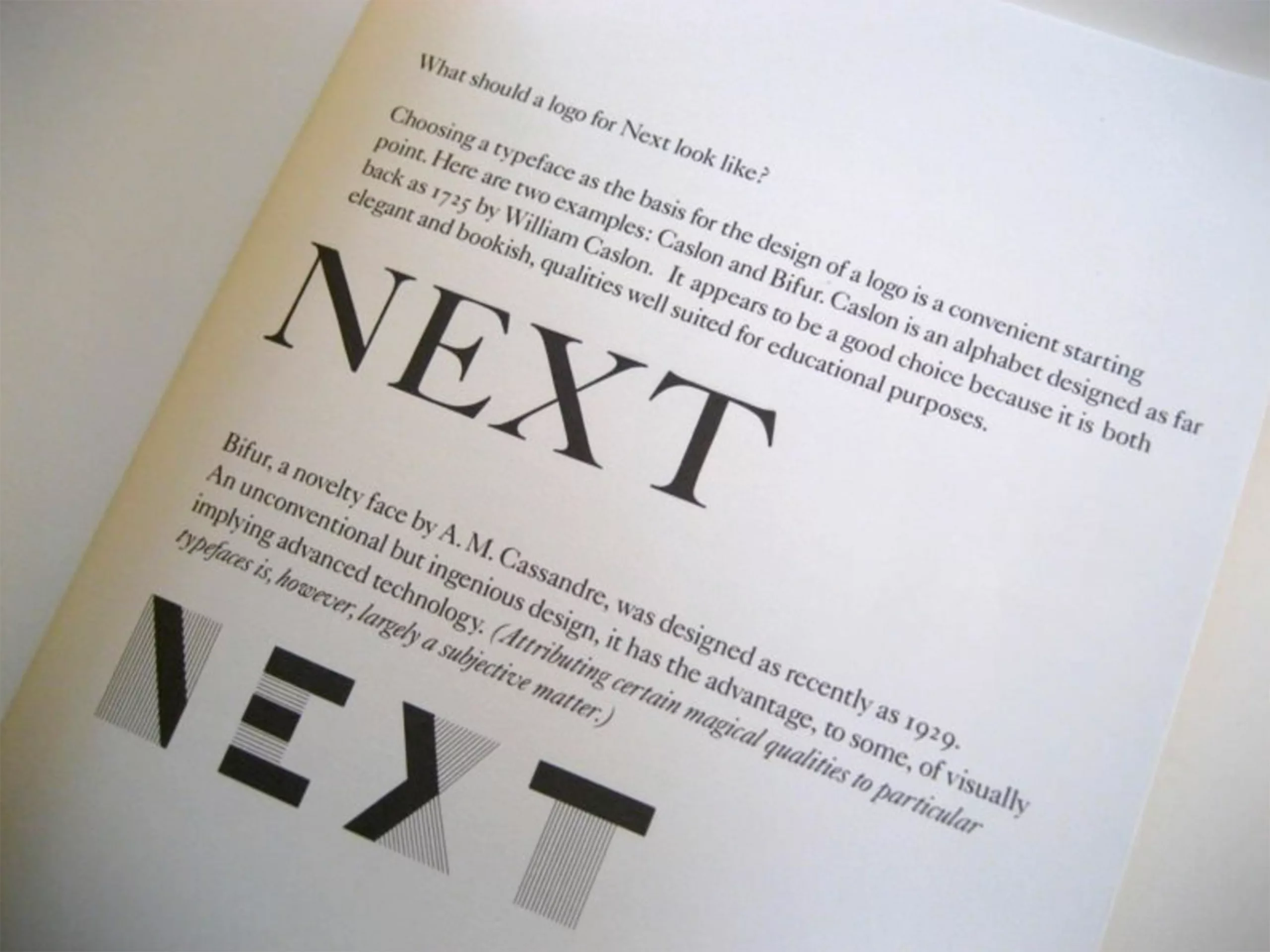 Dans son guide explicatif à destination du client, Paul Rand explique l’origine du choix qui a modifié Next en NeXT : la proximité du mot avec « Exit ». En incluant un « e » en bas de casse, qui avoisine des caractères en majuscules, le mot gagne un rythme nouveau et demande une autre forme de concentration du lecteur, qui lit alors le mot tel qu’il est vraiment écrit. À noter qu’aujourd’hui encore, on écrit NeXT dans du texte courant, comme s’il s’agissait s’un acronyme : le concept de Rand a dépassé le graphisme.