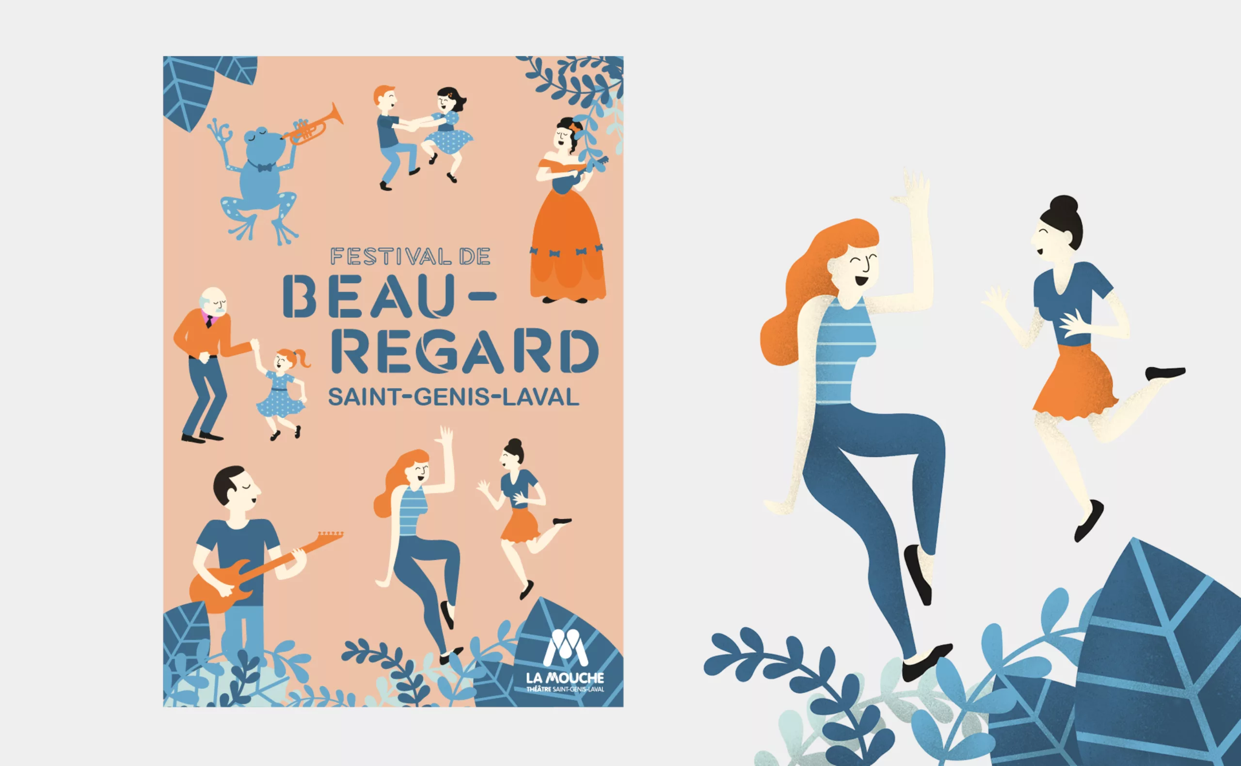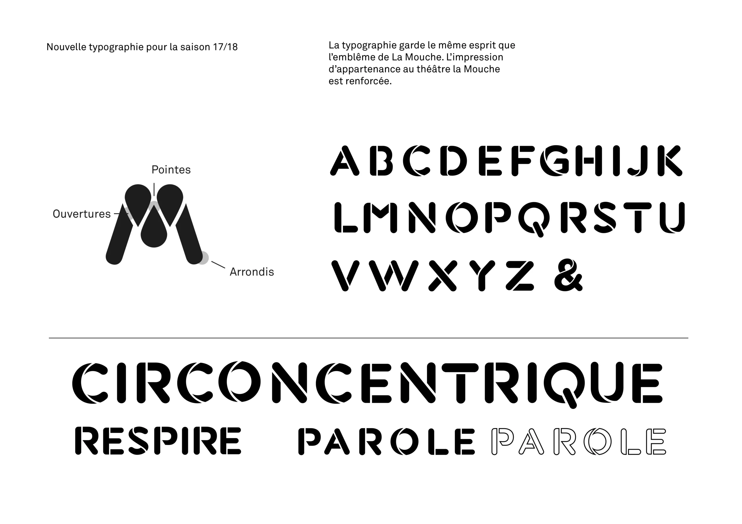 Le nouveau système visuel s’accompagne de la création d’un caractère typographique sur-mesure dont le dessin présente des ouvertures caractéristiques héritées du style graphique du monogramme “M” du logotype “LA MOUCHE”. Ce lettrage est destiné à être utilisé pour composer des éléments de titrage sur l’ensemble des supports de communication du centre culturel. C’est un code visuel flexible qui permet de créer un territoire de marque efficace, original et identifiable.